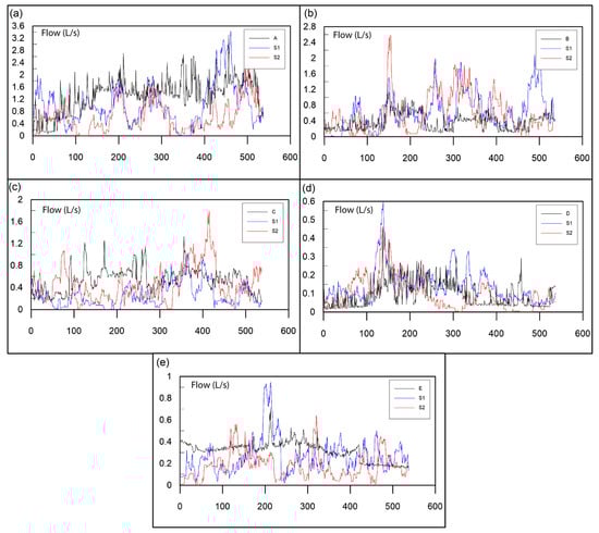 In practice, the variation of drinking water demand is often estimated in an approximate way from measurements taken in one supply pipe, assuming that this variation curve can be applied to any other section of the network, no matter the number of users connected. However, studies like [] demonstrate that this approach is limited, because the real consumption at household level has a very stochastic character, with short duration pulses and long periods with no demand. For this reason, they propose a methodology based on the Neyman–Scott Rectangular Pulse Mode (NSRPM), which can reproduce the instantaneous variation of demand at different aggregation levels and under continuous or intermittent supply conditions.