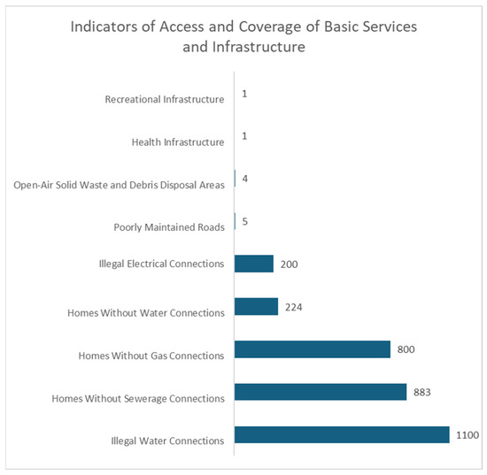 Secondly, 15 indicators related to access and coverage of basic services and infrastructure were identified (Figure 3). These indicators are essential to ensure infrastructure that meets the hygiene, comfort, and urban public service needs required by city residents, with the goal of improving their quality of life and health conditions.