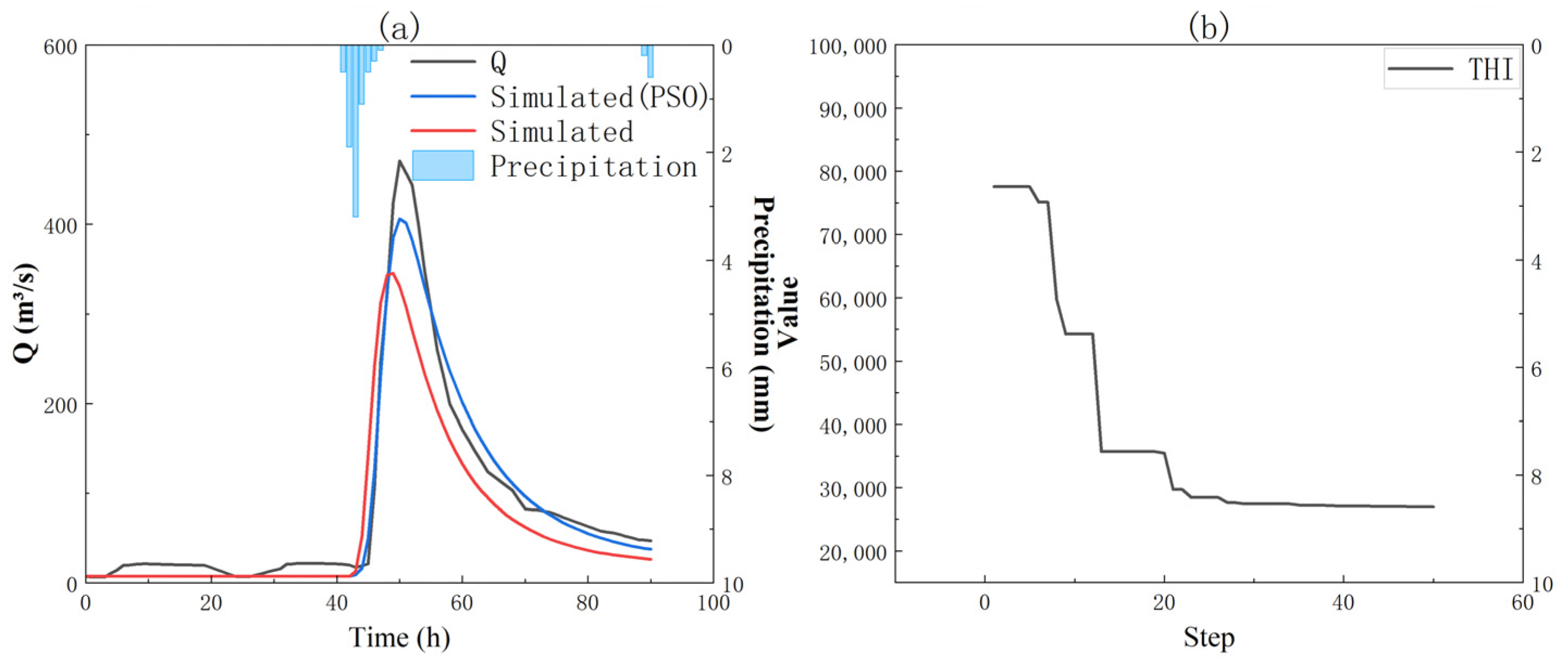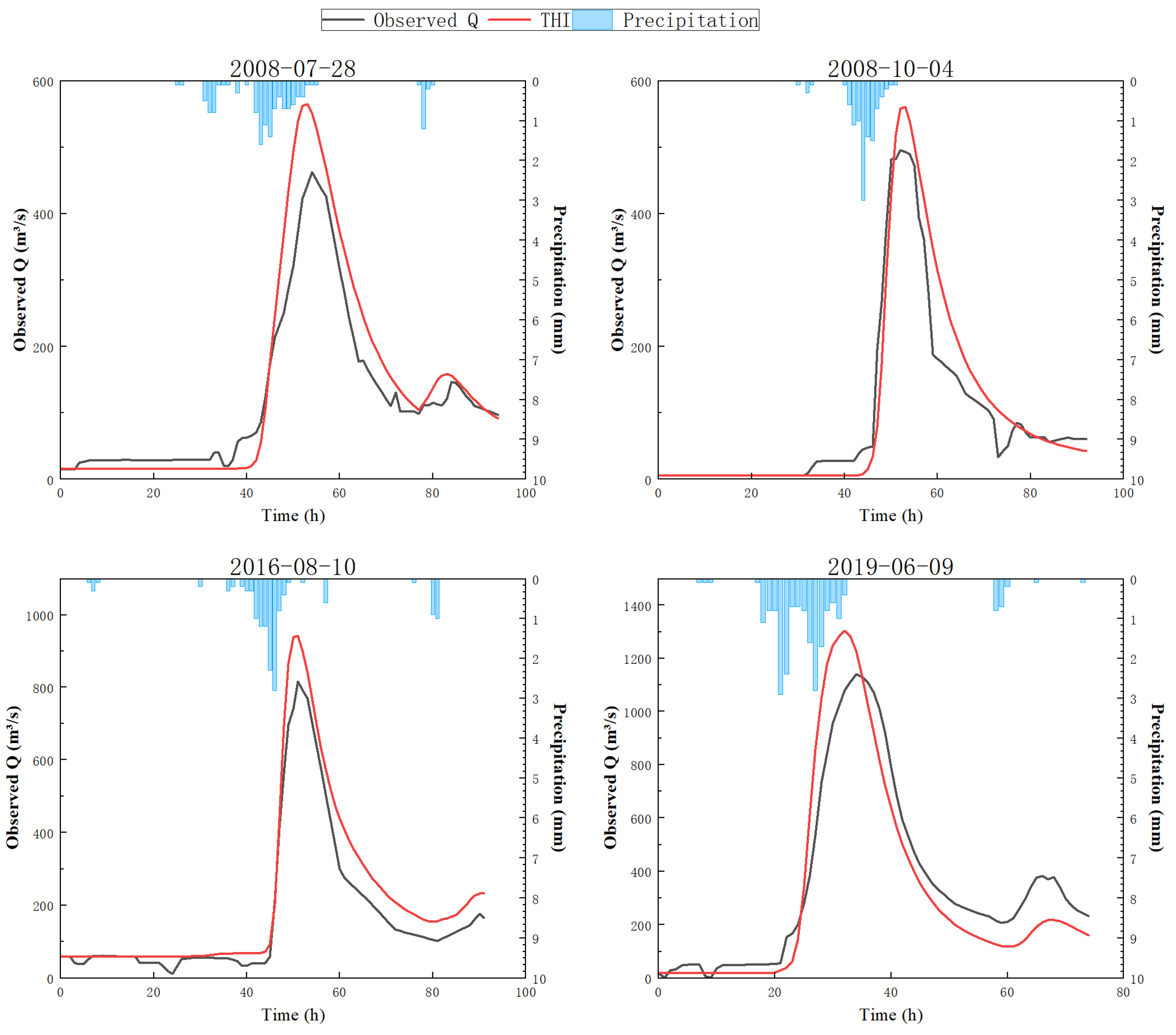 - The original Thiessen Polygon Method (THI) of the Liuxihe Model has limitations in watersheds with sparse rainfall stations. Based on the proximity principle, THI divides the watershed into discrete polygons. In the Hezikou Watershed with sparse rainfall stations (only seven stations, i.e., one station per 150 km2), the model prediction results are poor. Moreover, as the number of rainfall stations decreases and their distribution becomes uneven, the interpolation results lose a large amount of spatial heterogeneity information about rainfall; the abrupt rainfall changes at polygon boundaries are inconsistent with the actual gradual rainfall characteristics. In the upstream-only, downstream-only, and especially single-station scenarios, model performance deteriorates sharply: NSE and KGE values decrease significantly, while PRE and APTE increase significantly, failing to meet the accuracy requirements for flood forecasting.