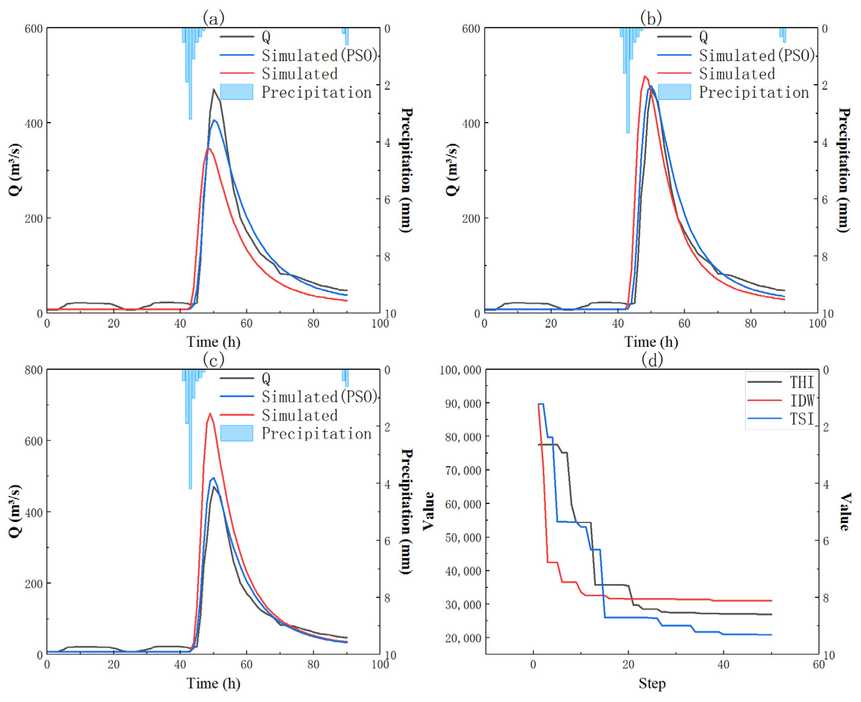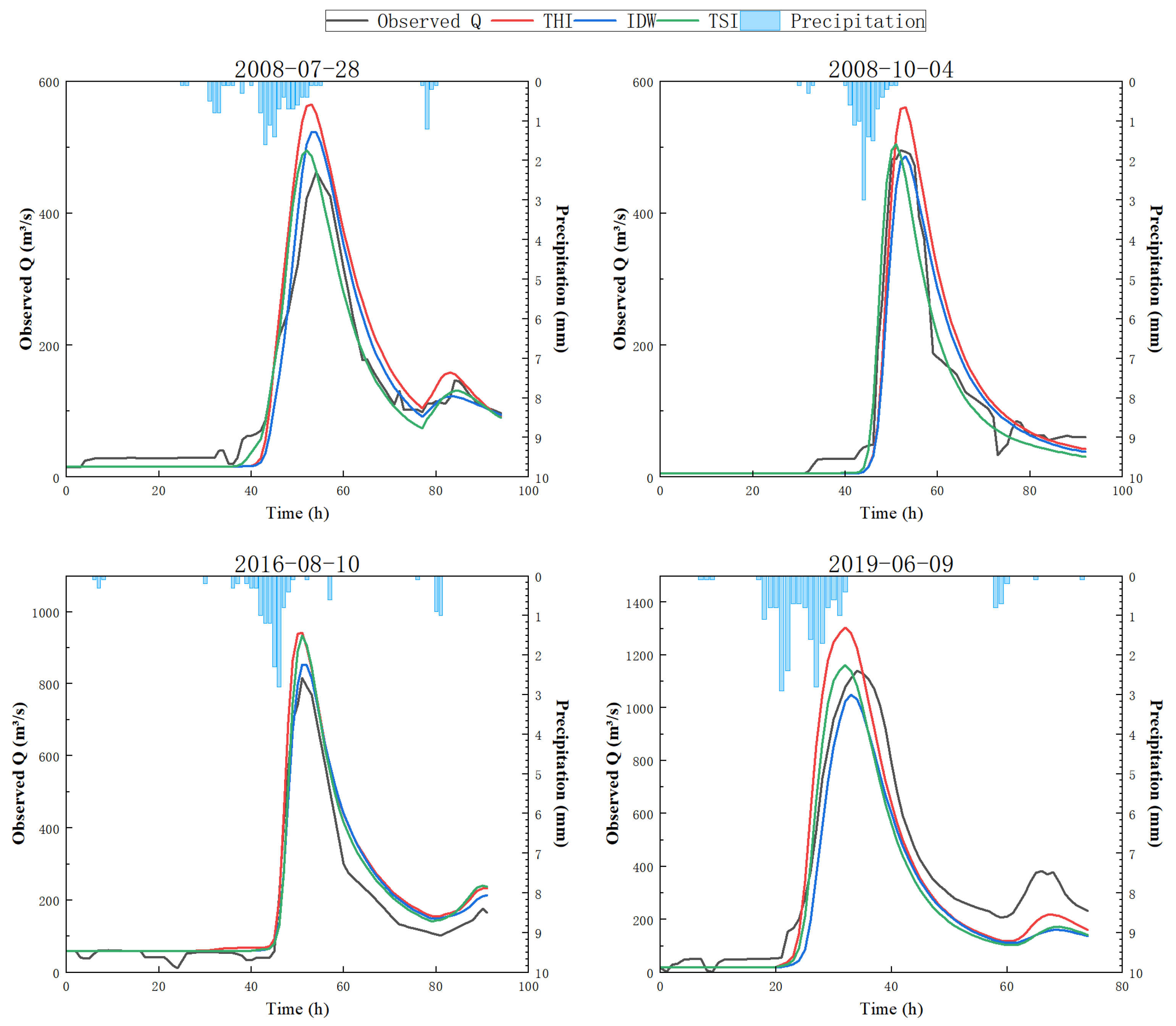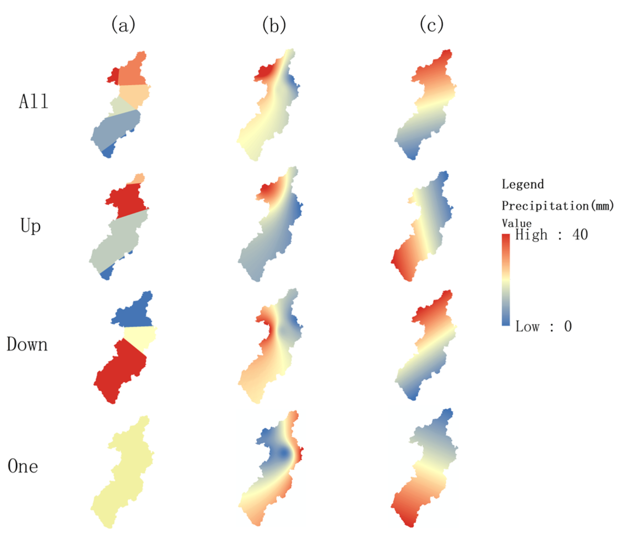 - TSI method: The interpolation results rely on global trend fitting. In the All scenario, the trend surface can well fit multi-station data; however, in the Up or Down scenarios, the trend surface is overly biased toward the area with concentrated stations. For example, in the Up scenario, rainfall in the upstream is overestimated and that which is in the downstream is underestimated, forming a “false gradient” unrelated to the actual terrain. This leads to deviations in the calculation of the model’s confluence process and significant changes in prediction results.