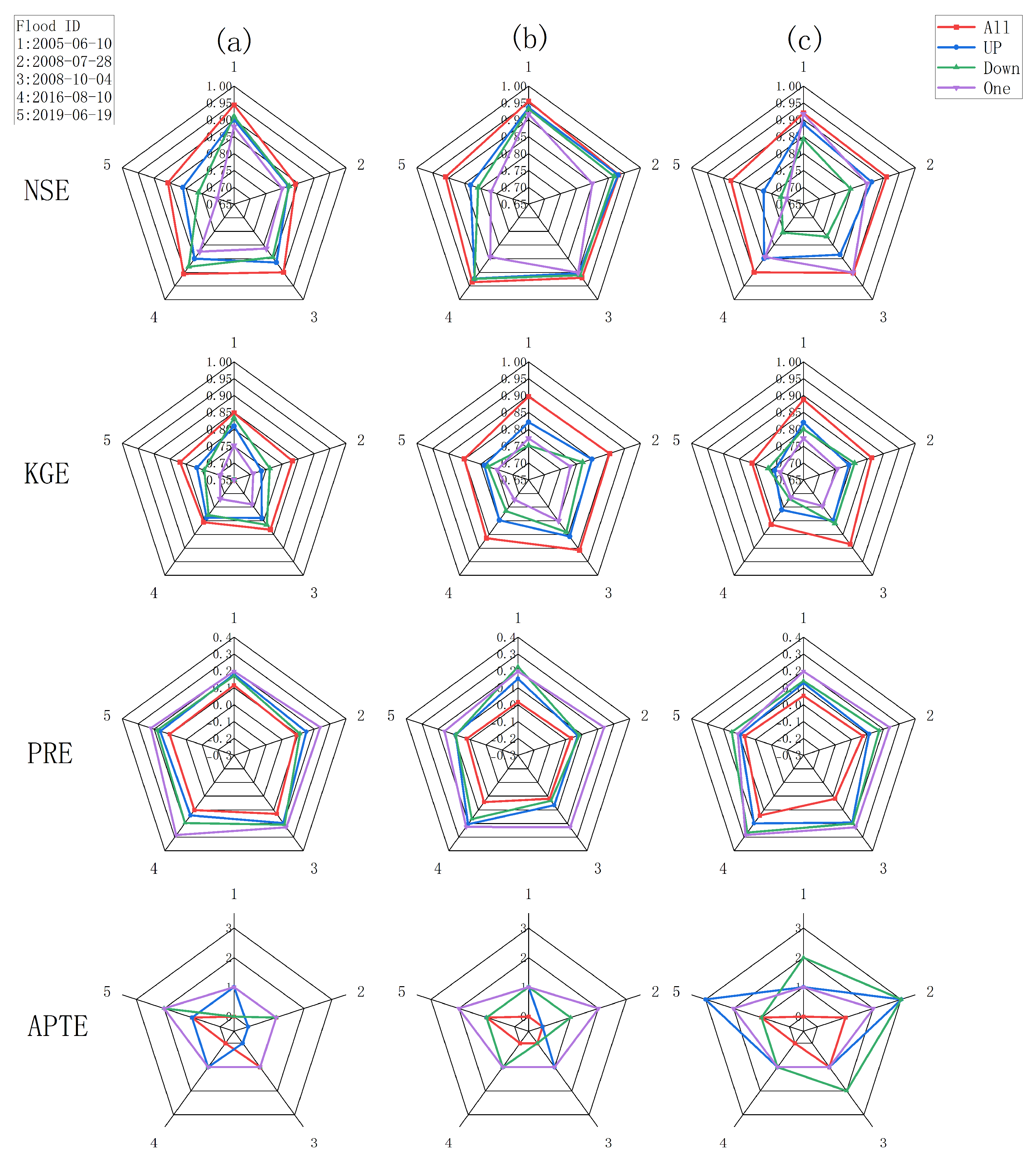 | Flood Identifier | NSE | KGE | R | PRE | APTE (h) |