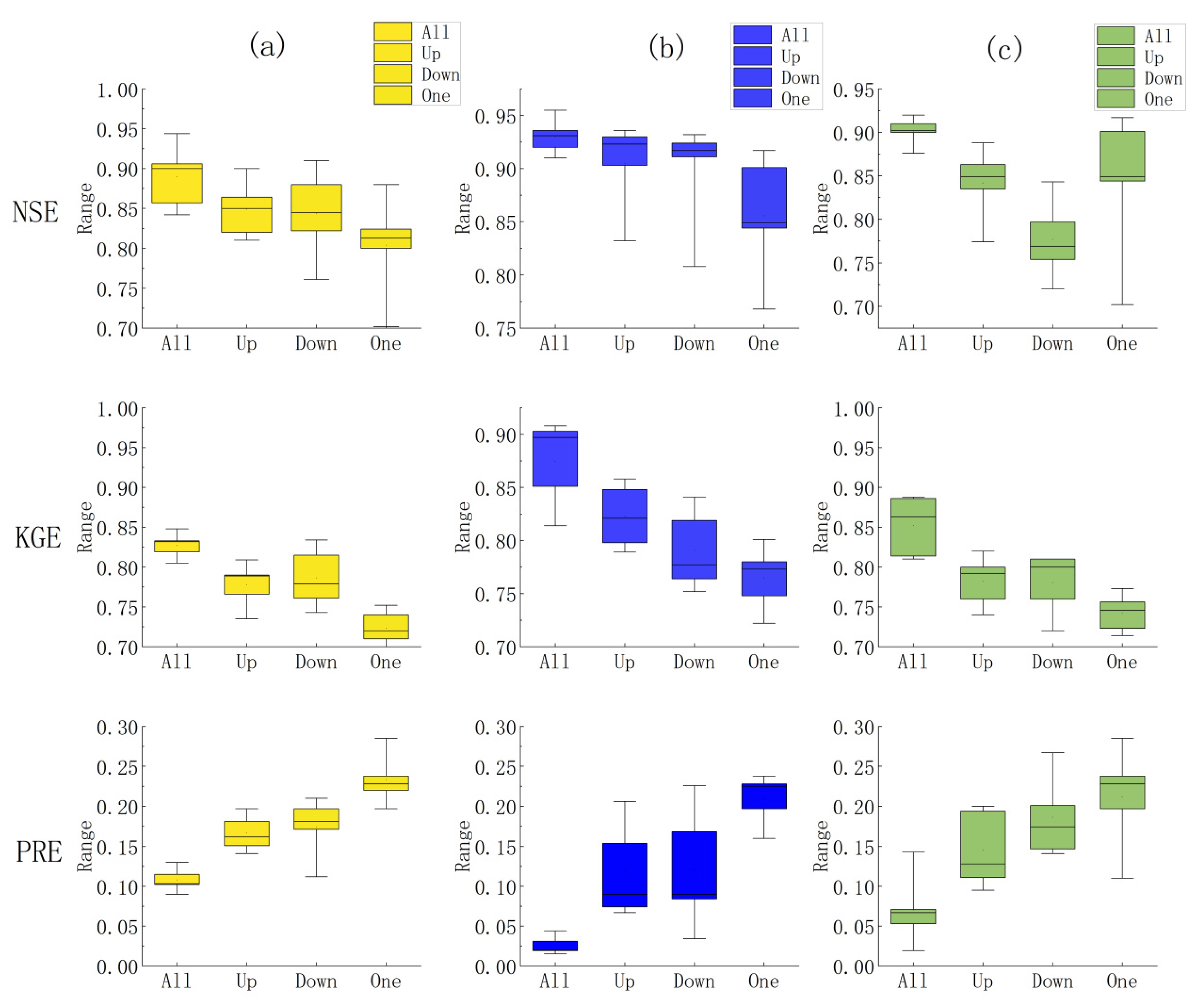 - TSI method: Its performance is close to that of IDW in the All scenario; however, the boxes change drastically in sparse scenarios (the median KGE drops below 0.7 in the Up scenario). Especially in the One scenario, the extreme value of PRE exceeds 0.3. Single-station data cannot support global trend fitting, leading to significant deviations between the spatial distribution of rainfall and reality, and “trend misjudgment” in the model’s response to flood processes.