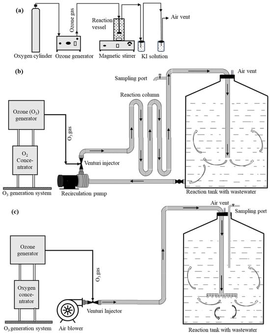 The effects of different advanced oxidation processes and delivery systems on the removal of p-chlorocresol in tannery wastewater during 24 h field trials are presented in Table 3. The studies compare O3 treatment alone, O3 combined with Fenton’s reagent, and Fenton’s reagent alone across varying O3 delivery approaches, reactor volumes, and circulation systems.