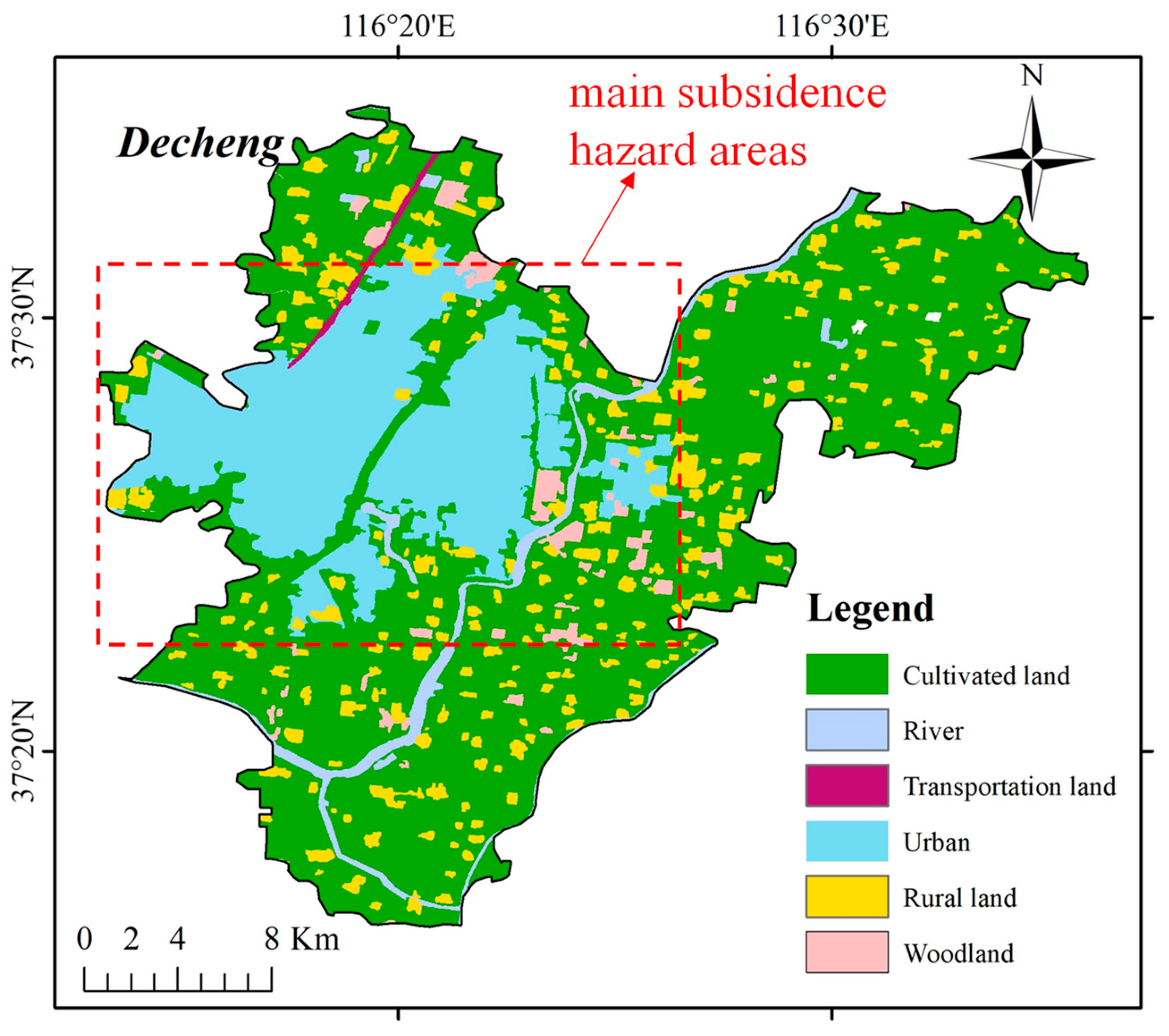 - Zhang, Y.; Li, H.; Shang, T.; Jia, C.; Liang, H.; Yang, Y. Extension theory-based division of land subsidence prone areas in Dezhou using analytic hierarchy process. Shandong Land Resour. 2016, 32, 58–64. (In Chinese) [Google Scholar]