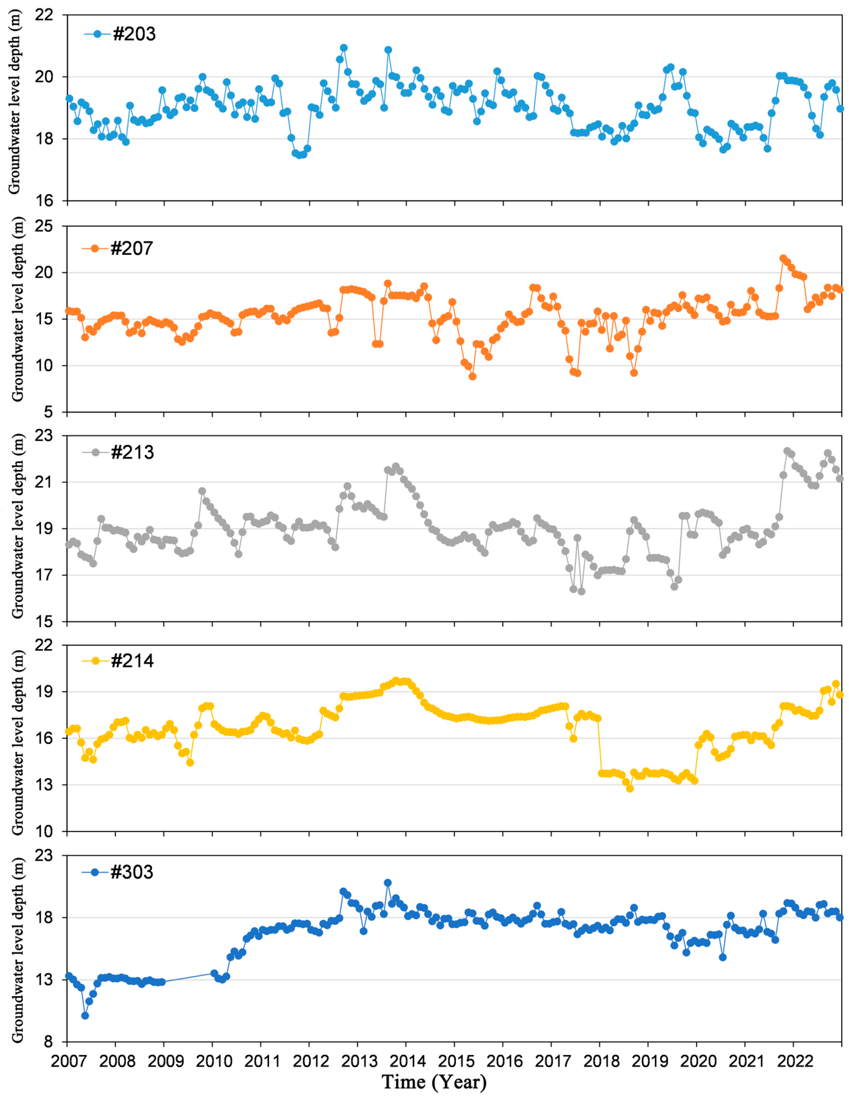 - Jia, C.; Zhang, S.; Sun, X.; Di, S.; Ding, P. Correlation between groundwater extraction and land subsidence in the Northwest Shandong Plain. China Sci. 2021, 16, 173–180. (In Chinese) [Google Scholar]