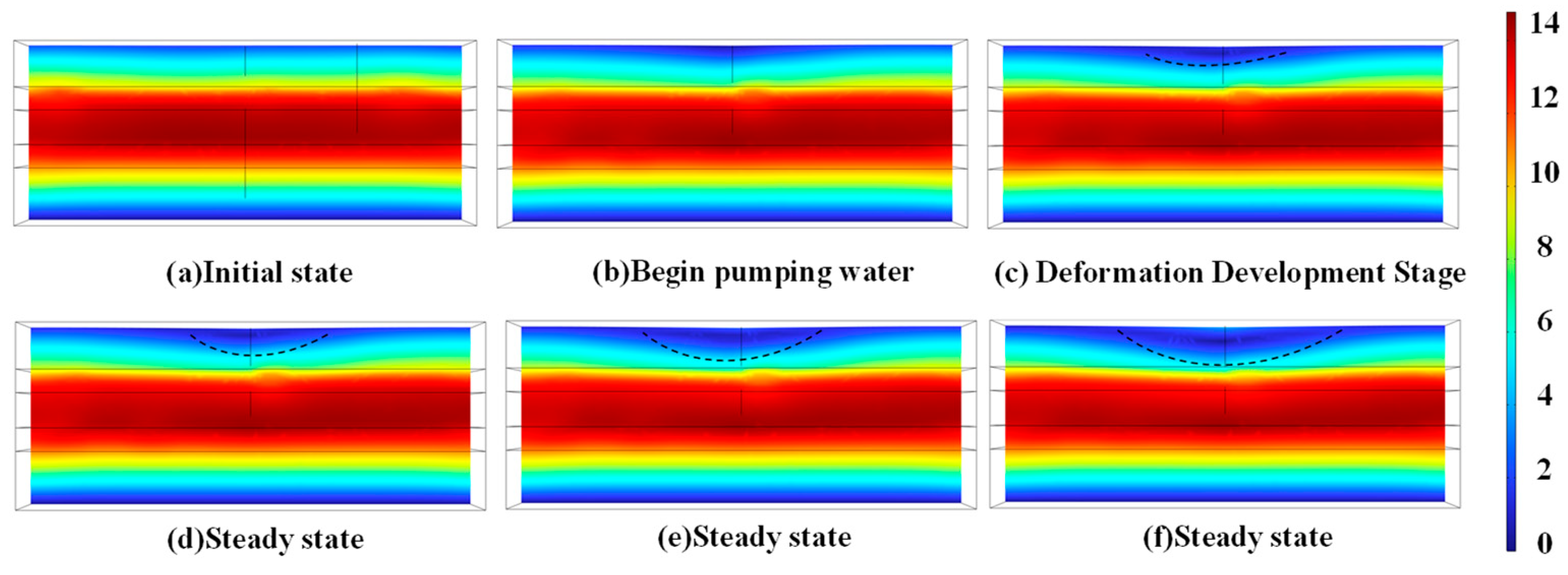 - Du, J.; Zhang, Y.; Luo, Z.; Zhang, C. Prediction of Ground Subsidence Induced by Groundwater Mining Using Three-Dimensional Variable-Parameter Fully Coupled Simulation. Water 2024, 16, 2487. [Google Scholar] [CrossRef]