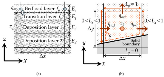 where cs is the sediment concentration in the bedload layer with the value 0.3 [52]; Es is the thickness of the bedload layer; λ is the porosity of the bed material (=0.4); qbxl and qbyl are the bedload transport rates for the l-th grain per unit width in the x and y directions, respectively; Et is the transition layer thickness (0 < Et ≤ Ed); Ed is the deposition layer thickness; and ftl is the fraction of l-th grain in the transition layer.