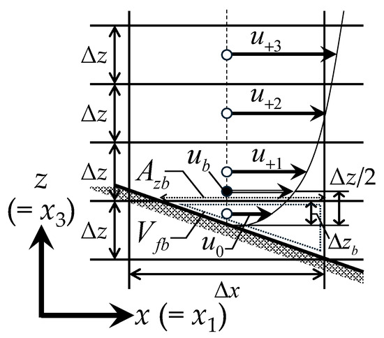 where Δb = Δzb/Δz; u0 is the flow velocity in the x direction at the lowest calculation cell; and u+1, u+2, and u+3 are the flow velocities in the x direction in the upper cells from the lowest calculation cell.