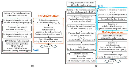 Flowcharts of flow and bed deformation calculations using two hydrodynamic models: (a) 2D model; (b) 3D model (Δt is the calculation time step).