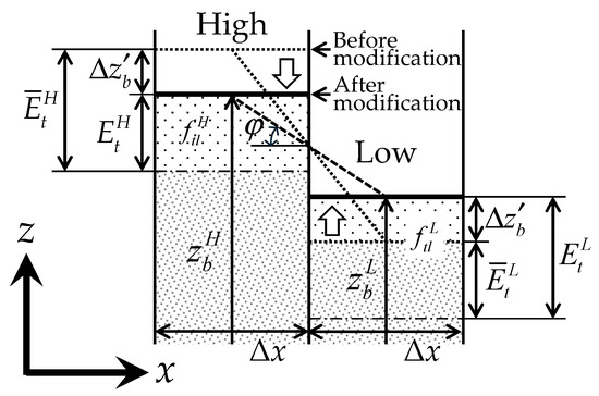 where the superscripts L and H indicate the lower and higher bed level values, respectively; the superscript bars indicate before-modification values; and Δzb′ is the modification value of bed level.