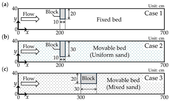 In this study, numerical simulations were conducted for three hydraulic experiments performed in the same channel [35,36]. Schematics of the experimental channels are shown in Figure 8, and the experimental conditions are summarised in Table 1. A straight steel channel measuring 7.0 m in length, 0.4 m in width, and 0.4 m in depth was used. The experiments simulated conditions in which a steep channel slope and a non-overflow block on the left bank represented a constriction caused by large boulders in a mountainous river.