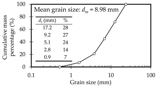 Case 3 (Michiue et al. [35]) was another movable bed experiment, this time using mixed sand. A block measuring 0.2 m wide, 0.3 m long, and 0.4 m high was placed on the left bank, 3.0 m from the upstream end of a channel with a slope of 1/25 (Figure 8c). The constriction was relatively wide and long. Figure 9 shows the grain size distribution of the bed material used in this experiment. The mean grain size dm was calculated as the sum of the five characteristic grain sizes shown in Figure 9, each multiplied by its respective proportion. The mixed sand was laid flat, and a constant discharge of 0.00635 m3/s was applied. The upstream and downstream bed boundary conditions were identical to those in Case 2. A static equilibrium state with no observable sediment transport was reached 10 min after the start of the discharge. Flow velocity was not measured in Case 3; however, the water level, bed level, and mean grain size of the surface material were measured after flow cessation.