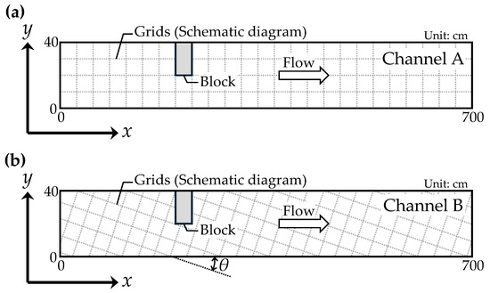 The numerical models developed in this study introduced the FAVOR method into the governing equations so that flows and bed deformations could be smoothly analysed, even for boundary shapes that did not follow the coordinate system. To confirm the effectiveness of introducing the FAVOR method, this study conducted analyses on two channels: In Channel A, the calculation grids were aligned with the x-y coordinate system and the channel shape; and in Channel B, the grids were rotated clockwise by θ (tan θ = 1/3) from the x-y coordinate system, as shown in Figure 10. The calculation conditions are listed in Table 2. In a previous study using the presented 3D model, we conducted a sensitivity analysis on flow around a cylinder by varying the grid size [47]. The results showed that the 3D model could accurately reproduce the flow when the target structure was resolved with approximately 10 or more grids. Michiue et al. [35] and Nagase et al. [36] performed analyses using 2D models, employing grid sizes of Δx = Δy = 0.02 m. Therefore, in this study, the grid size was determined so as to resolve the blocks with approximately 10 grids, resulting in a smaller grid size than that used by Michiue et al. [35] and Nagase et al. [36]. The analyses were then performed using Channels A and B for experimental Cases 1 and 2, respectively.