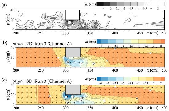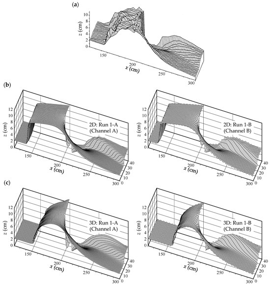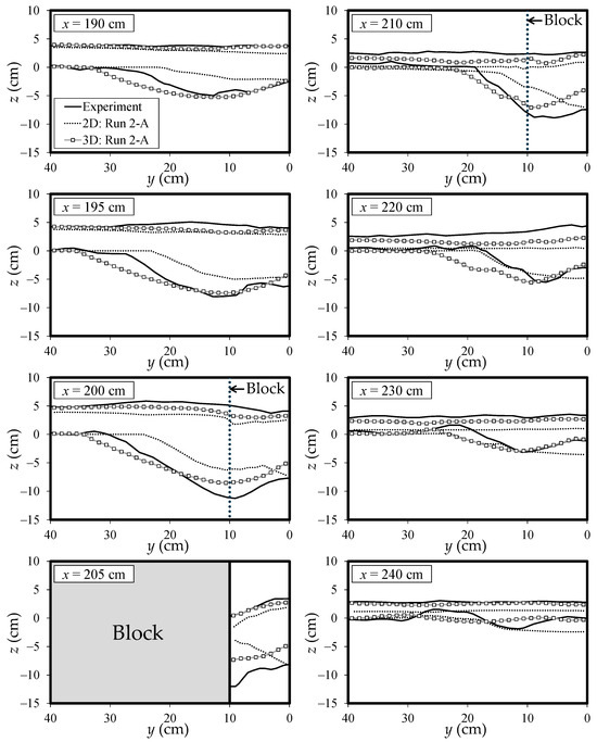 As described above, previous analyses of bed deformation, including local scour around structures in supercritical flow fields, have been conducted using 2D models. However, even in supercritical flow fields, 3D flows inevitably occur around structures; thus, 2D models assuming hydrostatic pressure distribution cannot adequately reproduce local scour induced by these flows (e.g., [34,39]). Therefore, 3D models are necessary for accurate local scour prediction, even in these flow conditions. Alternatively, 2D models remain practical, and depending on hydraulic conditions and required accuracy, they may still be suitable for predicting bed deformation, including local scour. It is crucial to understand the differences between 2D and 3D models when considering the practical application of 2D models; however, these differences have not yet been clarified for bed deformation analyses in supercritical flow fields. Although Lane et al. [40] and Abdo et al. [41] compared 2D and 3D models for flows in river confluences and supercritical flows at contractions, respectively, they did not consider bed deformation.
