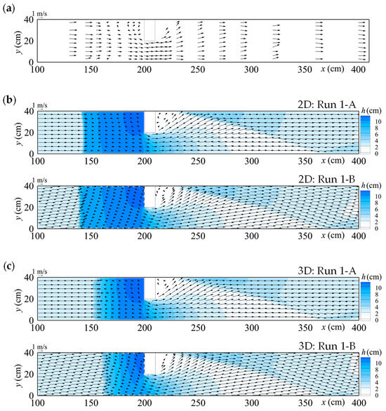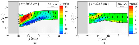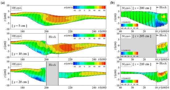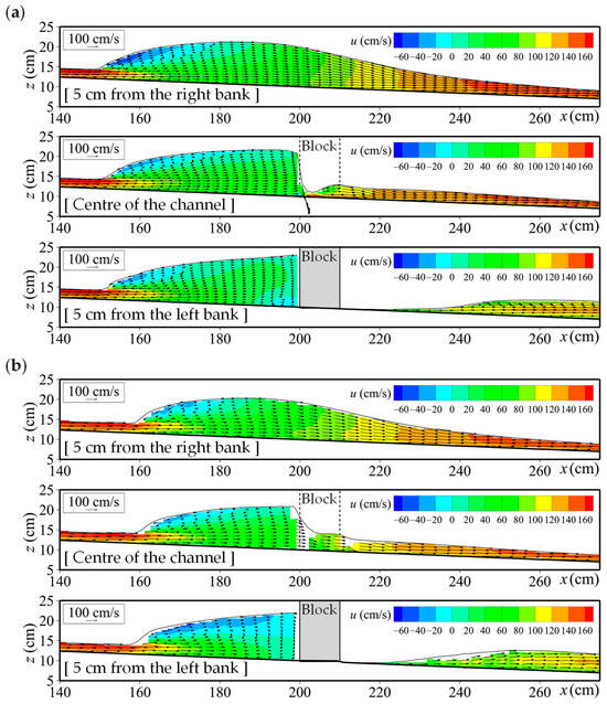 Case 1 (Michiue et al. [35]) was a fixed-bed experiment with a channel slope of 1/25. A block measuring 0.2 m wide, 0.1 m long, and 0.4 m high was placed on the left bank, 2.0 m from the upstream end (Figure 8a). A constant flow discharge of 0.00136 m3/s was introduced, and the flow velocity and water level were measured using an electromagnetic current meter and a servo-type water level meter, respectively. Flow velocity measurements were taken at a single point at mid-depth, excluding locations with very shallow flow.