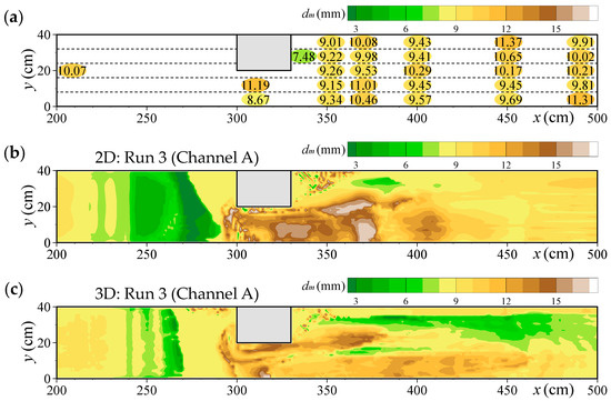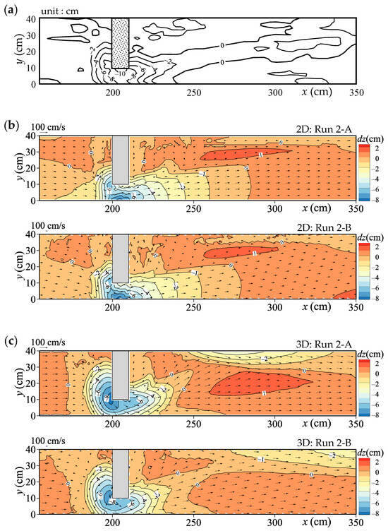 Case 2 (Nagase et al. [36]) involved a movable bed experiment with uniform sand. A block measuring 0.3 m wide, 0.1 m long, and 0.4 m high was placed on the left bank, 2.0 m from the upstream end of a channel with a slope of 1/30 (Figure 8b). The constriction was narrow and short in the downstream direction. Uniform sand with a grain size of 7.46 mm was spread evenly, and a constant flow discharge of 0.00456 m3/s was applied. No sediment was supplied from upstream, and a downstream weir—at the same height as the initial bed—prevented bed degradation. Sediment transport ceased 10 min after discharge began, at which point velocity and water level were measured as in Case 1. The bed level was measured with a point gauge after the flow stopped.