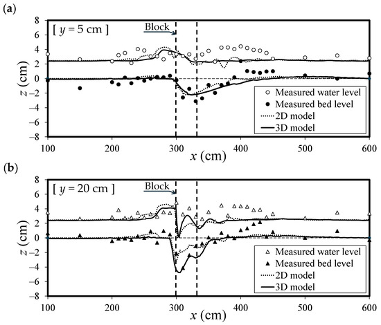 The flow depth h becomes very small immediately downstream of the structures placed in the supercritical flow fields, and in some cases, the calculation grids dry up. In n the fixed-bed experiment conducted by Michiue et al. [35], discussed in Section 3.1 and Section 4.1, drying up occurred behind a block. Therefore, the following dry-bed conditions were imposed on both flow models. In the 2D model, a minimum flow depth hmin was set, and when the flow depth of the target cell became smaller than hmin, the flow discharges per unit width (or the depth-averaged velocities) of that cell were calculated from the momentum Equations (2) and (3), excluding the advective and viscosity terms. The drying up and recovery of the flow depth were expressed by solving the continuity equation (Equation (1)). In the 3D model, the minimum flow depth hmin was set as that in the 2D model. When the flow depth of the target cell was less than hmin, both the flow depth and flow velocities of the cell were set to zero. When the water level in the surrounding cell was greater than 1.05 times hmin above the bed elevation of the dried-up cell, the flow depth of that cell was restored to hmin. Based on several calculations with various changes in calculation grid size and target conditions, hmin was determined automatically using