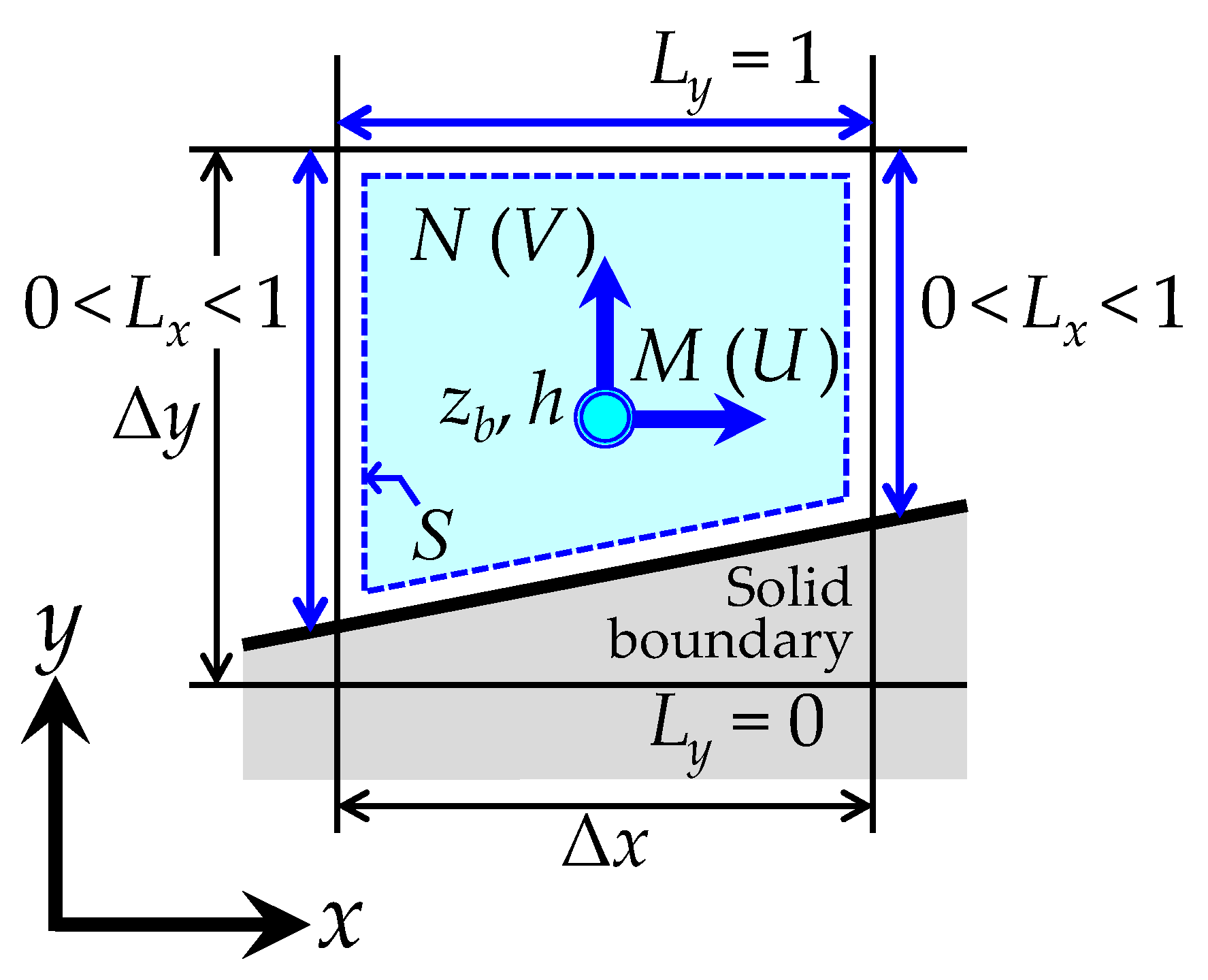 | Lx, Ly | fractional line ratios at the boundary of a horizontal calculation cell in the x and y directions, respectively (-) |