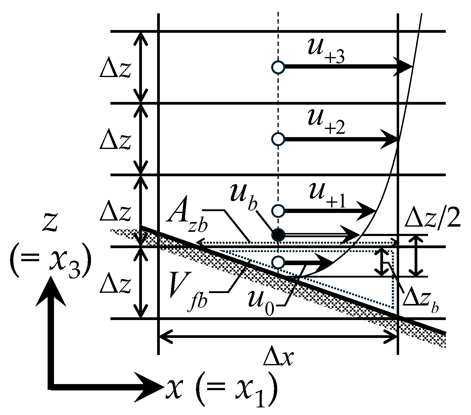 | Δzb | vertical grid size of the lowest calculation cell including the bed surface (m) |