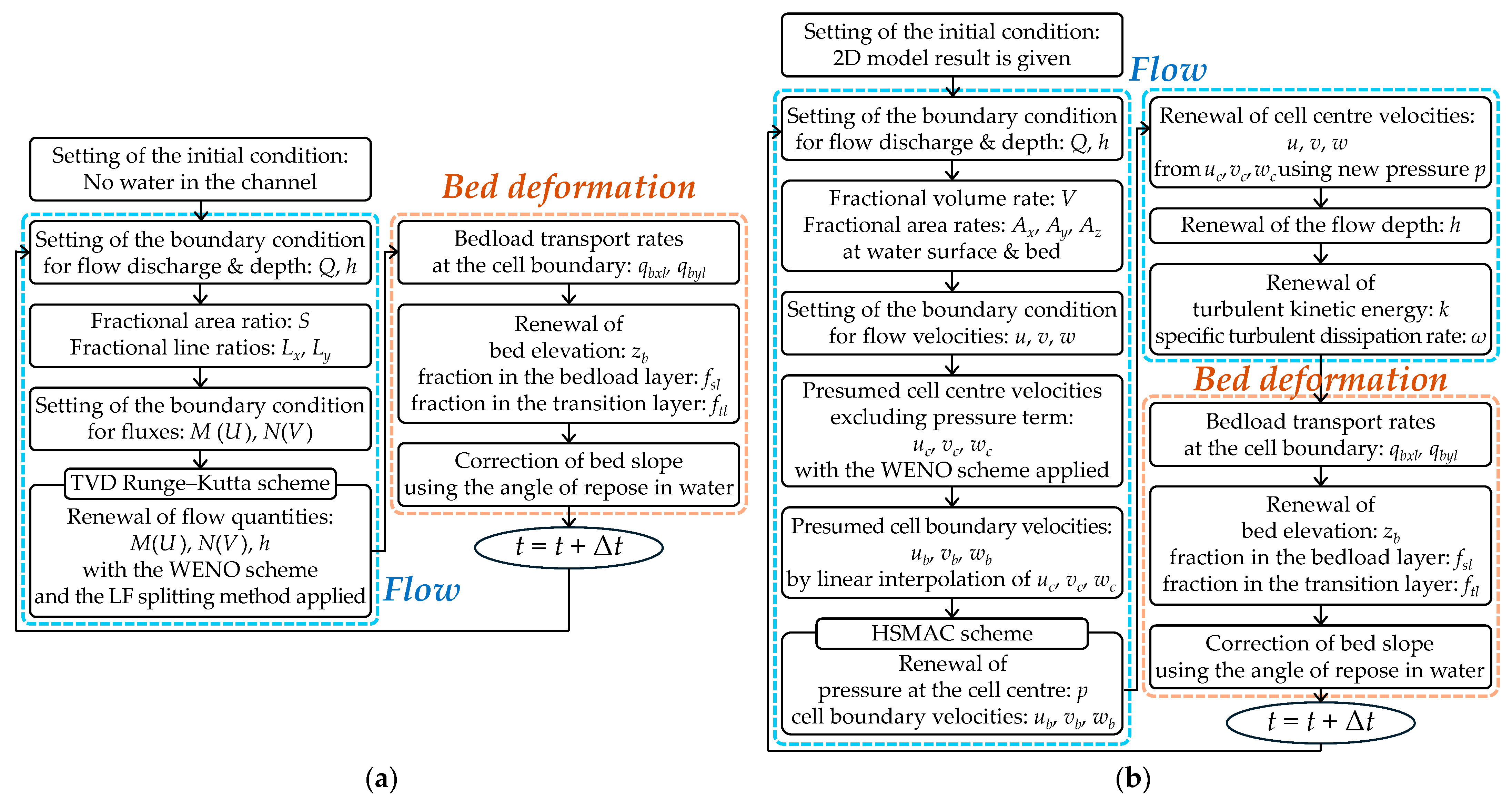 - Martínez-Aranda, S.; Murillo, J.; García-Navarro, P. Comparison of new efficient 2D models for the simulation of bedload transport using the augmented roe approach. Adv. Water Resour. 2021, 153, 103931. [Google Scholar] [CrossRef]