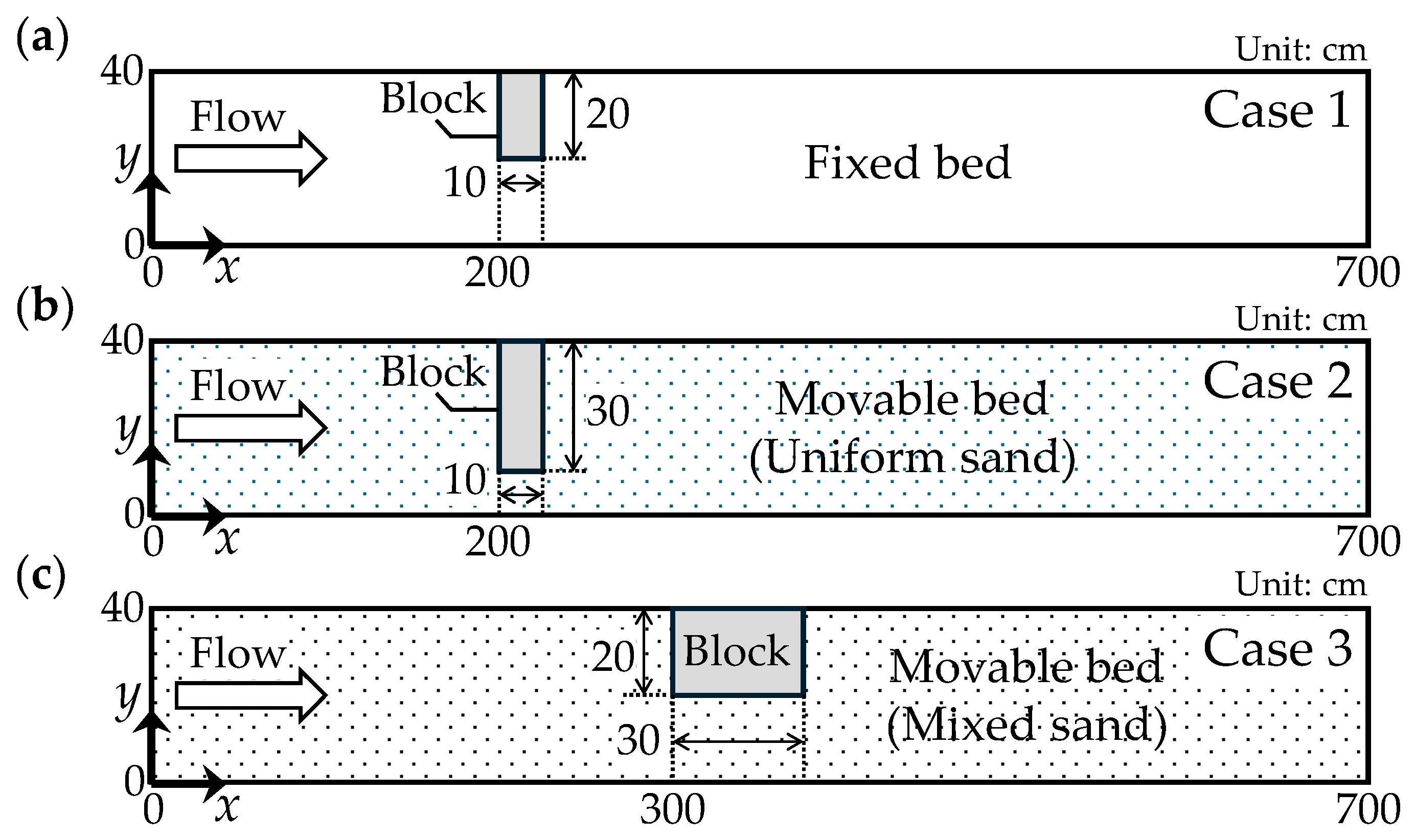 | Case | Bed Condition | Mean Grain Size in the Bed Material dm (mm) | Manning’s Roughness Coefficient n (m–1/3 s) | Bed Slope | Discharge Q (m3/s) | Uniform Flow Depth h0 (m) | Froude Number Fr |
