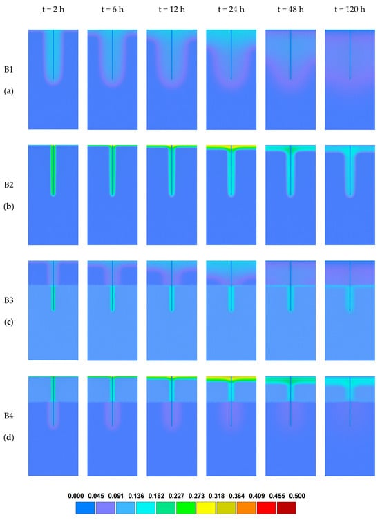 To investigate the influence of soil texture on water infiltration under preferential flow conditions, four simulation scenarios were established while keeping the crack structure (one crack, width 1 cm) and rainfall intensity (moderate rain) constant. The scenarios included: homogeneous sandy soil (B1), homogeneous loam soil (B2), layered profile with upper sandy soil (B3), and layered profile with upper loam soil (B4). The resulting soil moisture distributions for these scenarios are presented in Figure 6.
