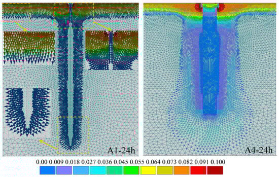 Comparison of the infiltration velocity vector of scenarios A1 and A4 at 24 h.