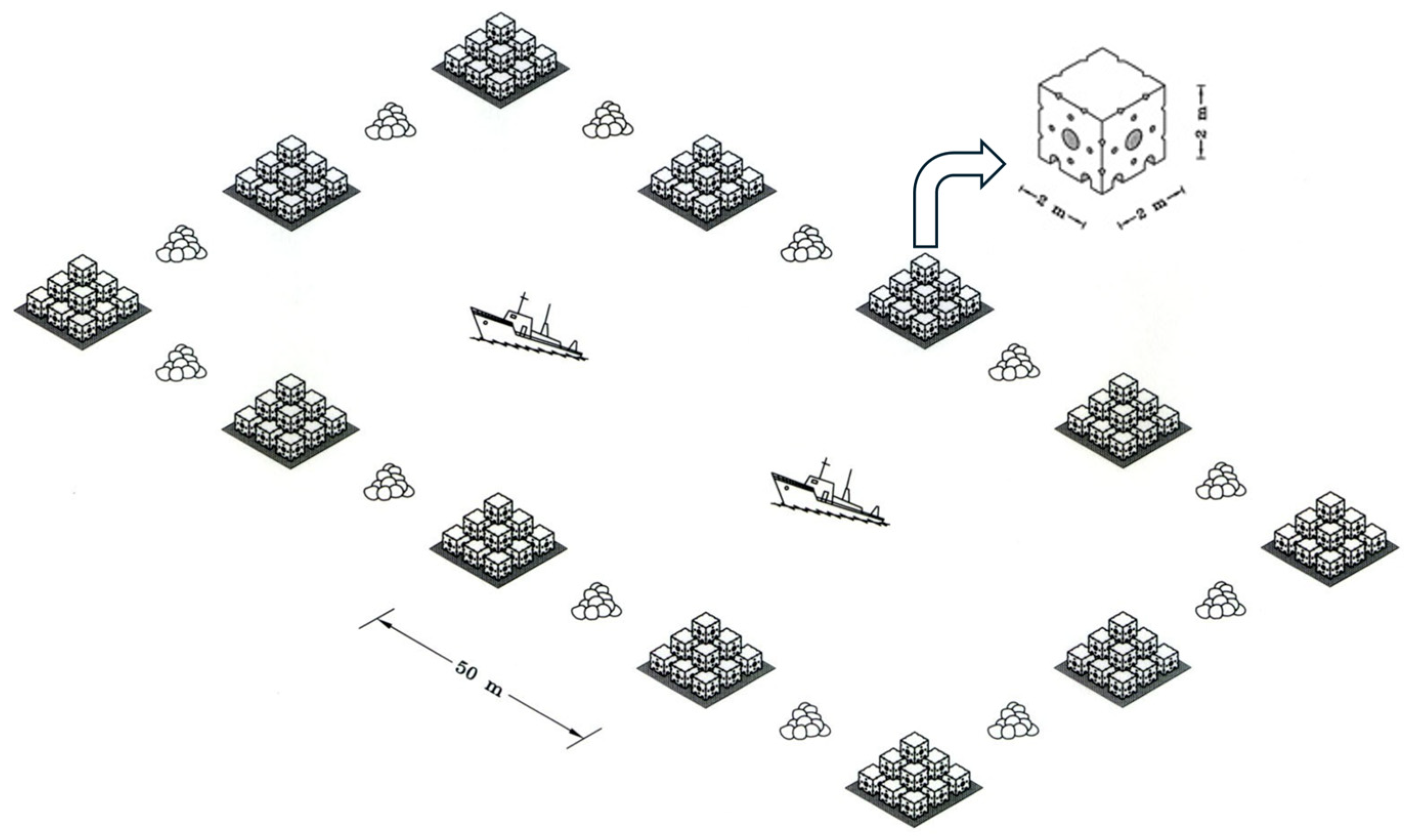 - Ino, T. Historical review of artificial reef activities in Japan. In Proceedings of the International Conference on Artificial Reefs, Houston, TX, USA, 20–22 March 1974; pp. 21–23. [Google Scholar]