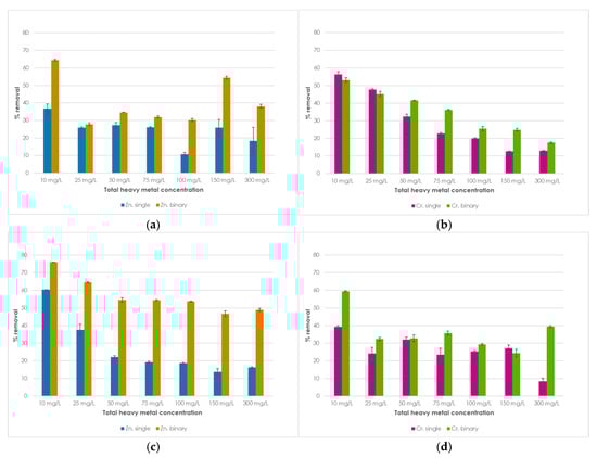 As reported in Figure 2b, the SCPs demonstrated a higher affinity for Cr adsorption than for Zn, as the tests carried out at the lowest metal concentrations resulted in a maximum removal of nearly 60%, in both single and binary solutions. The performance decreased, mostly following a linear trend, reaching around 13% and 18% at 300 mg/L of Cr, in single and binary solutions, respectively. This behavior may be attributed to the saturation of available binding sites on the SCP surface at higher concentrations, which can reduce the effectiveness of adsorption. Similar Cr adsorption yields in single and mixed solutions may reflect either the stronger interaction, compared to Zn, of Cr with functional groups on SCP or a preferential binding mechanism not influenced by the coexisting Zn ions.