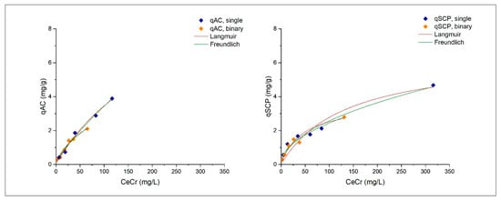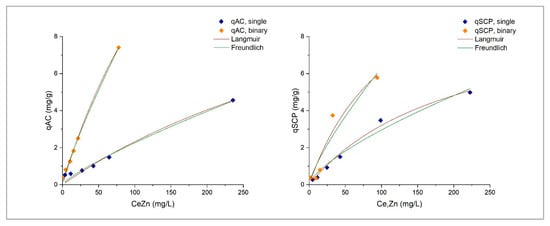 Figure 3 plots the Langmuir and Freundlich isotherm curves, and in Table 6, the parameters obtained from the modeling of experimental adsorption data for Zn on AC and SCPs in single and mixed solutions are presented.