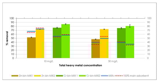 Regarding Cr removal efficiencies, they are similar to those obtained in tests on both mixes carried out in Cr solutions at a concentration of 10 mg/L, while the adsorptive performance is slightly higher than that observed in tests carried out at 50 mg/L of Cr. This result could indicate that the coexistence of Zn may have favored Cr retention on the adsorbent surface, possibly through mechanisms such as ternary complex formation or changes in surface charge distribution induced by the co-adsorbed cation [,].
