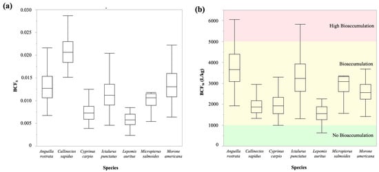 The accumulation tendencies from water and sediment were assessed using the bioaccumulation factor (BCF). Equations (1) and (2) were employed to calculate the BCFw and BCFs, respectively [,].