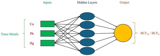 Artificial Neural Networks (ANNs) were used to model the nonlinear relationships between trace metal concentrations and bioaccumulation factors in aquatic organisms, proving effective under diverse conditions [,,]. The input variables to the ANN were the concentrations of individual trace metals measured in water and sediment, while the output variables were the corresponding bioaccumulation factors in water (BCFW) and sediment (BCFS).