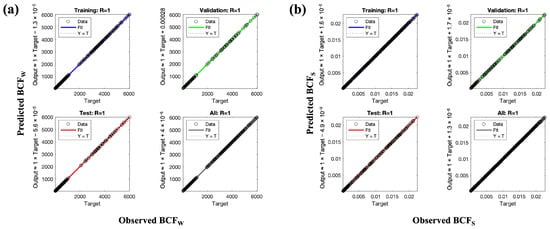 Correlation between experimental and ANN-predicted BCF values: (a) BCFW and (b) BCFS.