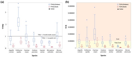 Through direct oral intake, humans are exposed to trace metals found in aquatic species, which carry both non-carcinogenic and carcinogenic dangers. This study evaluated the risk of trace metal exposure using the human health risk assessment approach suggested by the USEPA [], where the target populations were adults and children. The assessment was conducted in three sequential parts: (i) estimating the exposure dose from oral intake on a daily basis (EDI), (ii) calculating non-carcinogenic risk [hazard quotient (HQ) and target hazard quotient (THQ)], and (iii) determining carcinogenic risk (TCR) from life-time exposure.
