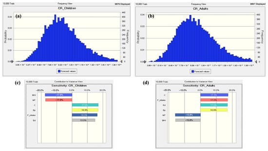 Predicted probability distribution [(a) children and (b) adults] and sensitivity analysis [(c) children and (d) adults] results of the TCR for the aquatic edible species.