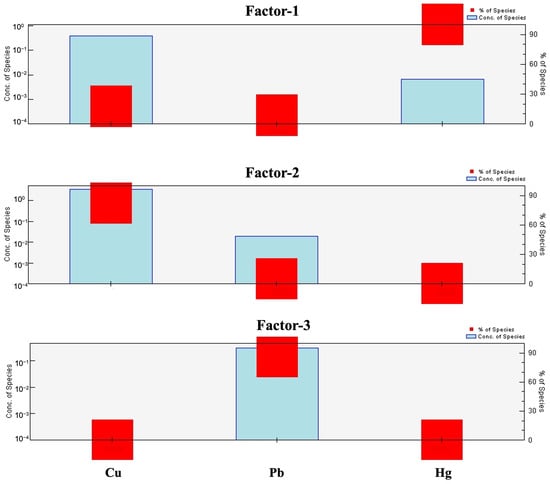 This study used a mathematical receptor model called EPA PMF (V.5.0; U.S. Environmental Protection Agency, Washington, DC, USA) to determine the sources of trace metals in aquatic edible species. This model was chosen because it incorporates uncertainty estimates into the factorization process, effectively handles missing and below-detection-limit data, and minimizes rotational ambiguity, ensuring more reliable source identification compared to other receptor models such as PCA or UNMIX. Moreover, EPA PMF 5.0 is widely validated and recommended by the U.S. Environmental Protection Agency for environmental source apportionment studies [].