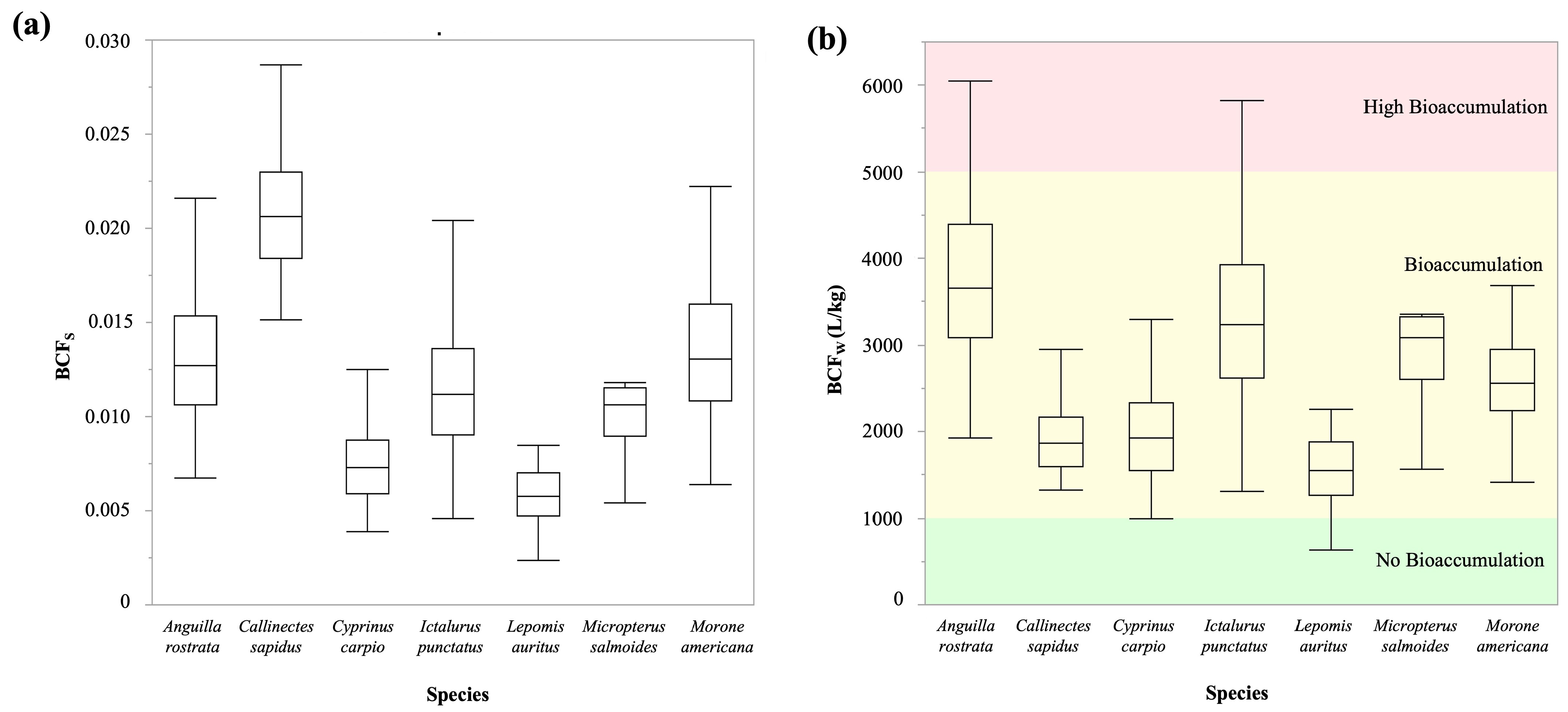 2.3. Water Bioaccumulation Factor (BCFW) and Sediment Bioaccumulation Factor (BCFS)