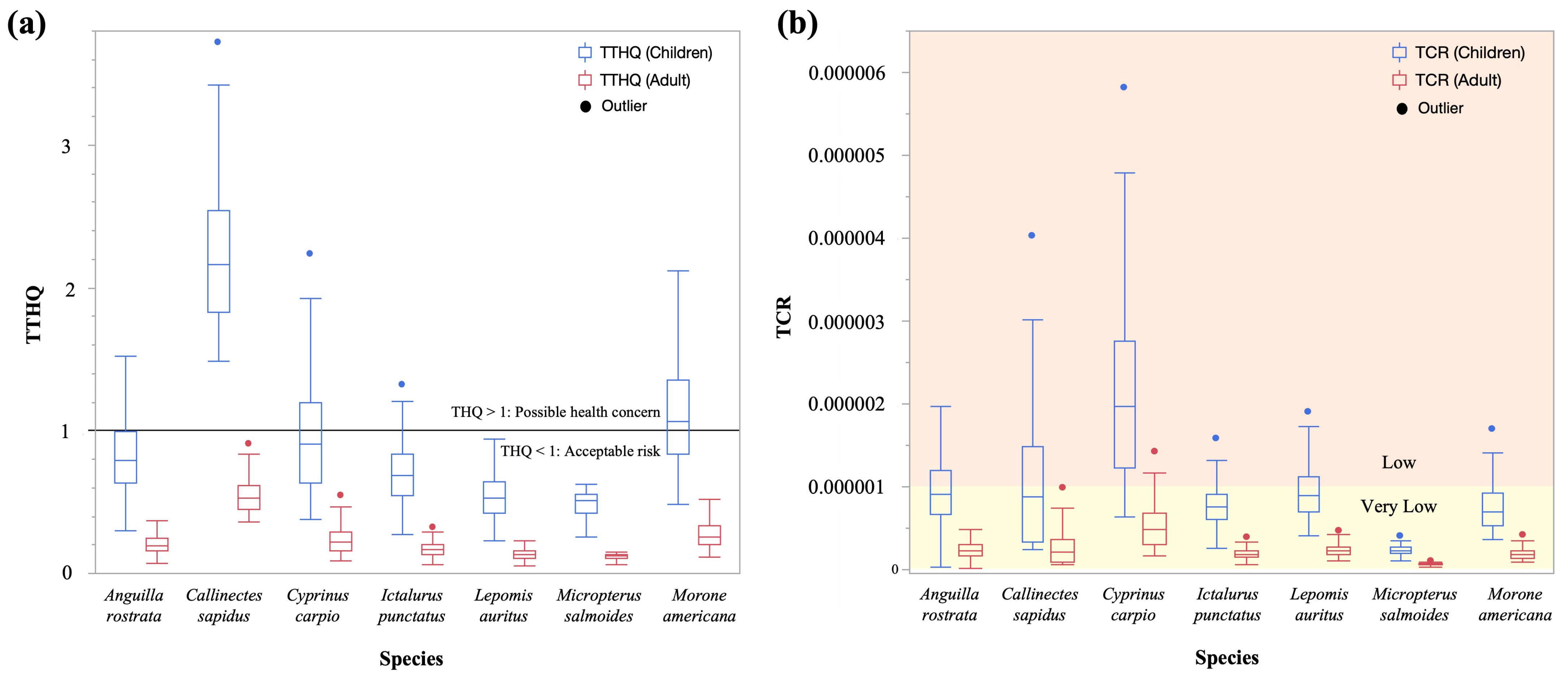 - Jia, Y.; Wang, L.; Cao, J.; Li, S.; Yang, Z. Trace Elements in Four Freshwater Fish from a Mine-Impacted River: Spatial Distribution, Species-Specific Accumulation, and Risk Assessment. Environ. Sci. Pollut. Res. 2018, 25, 8861–8870. [Google Scholar] [CrossRef] [PubMed]