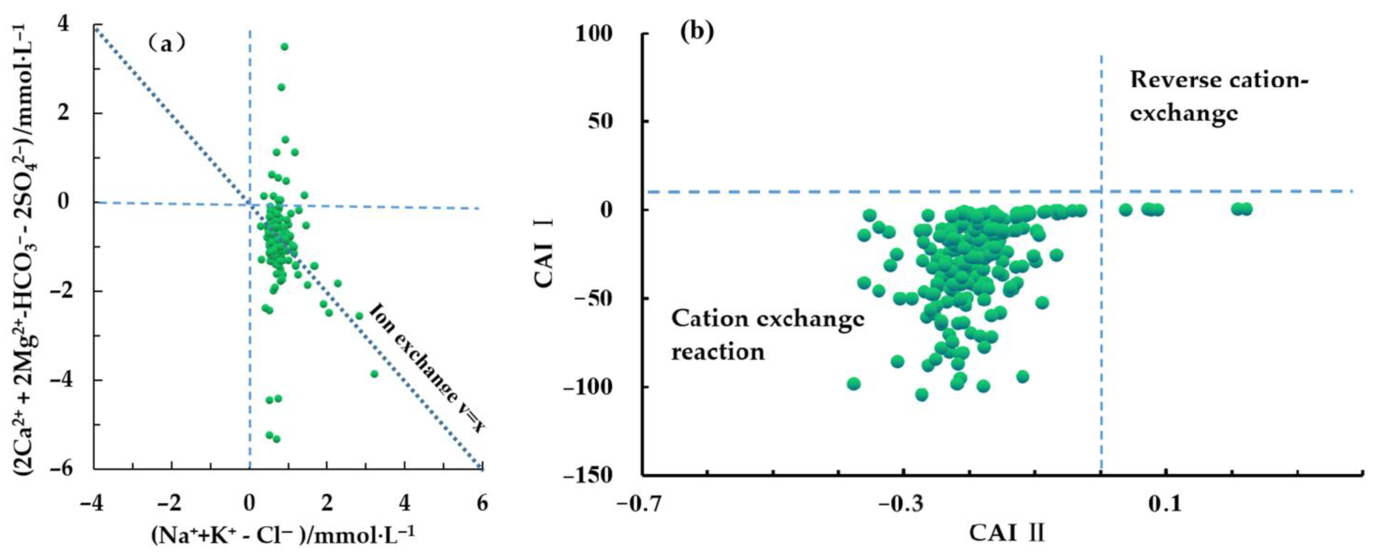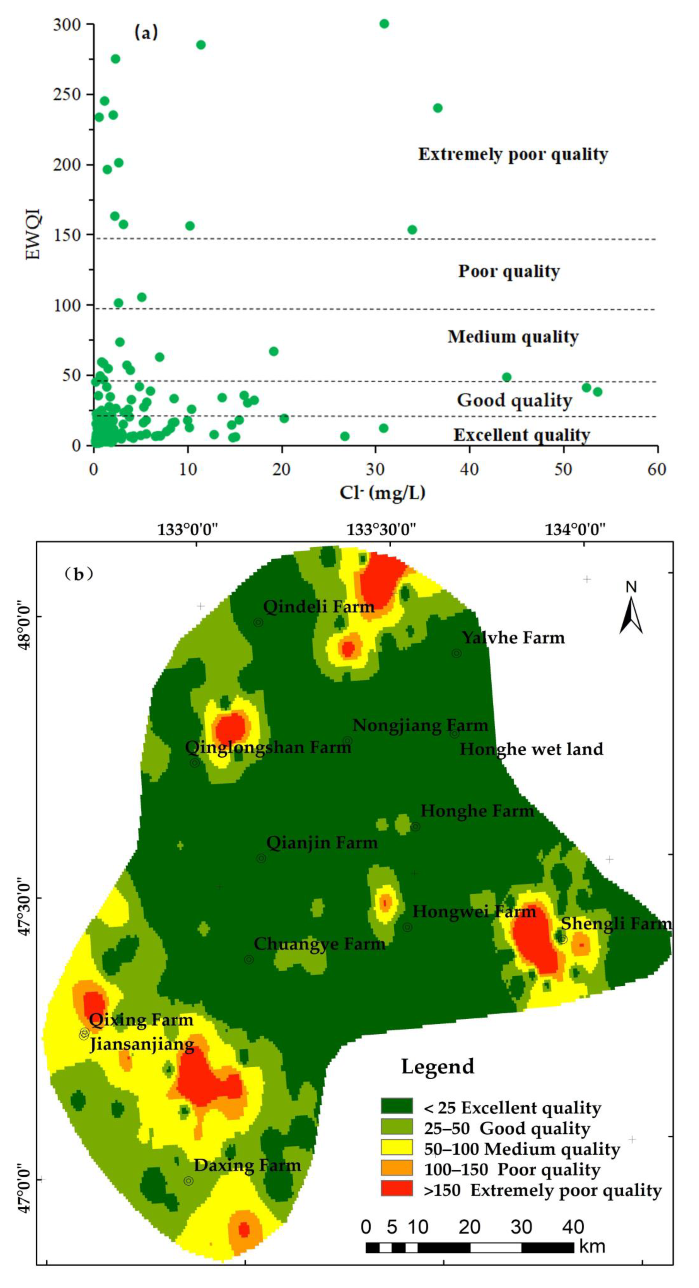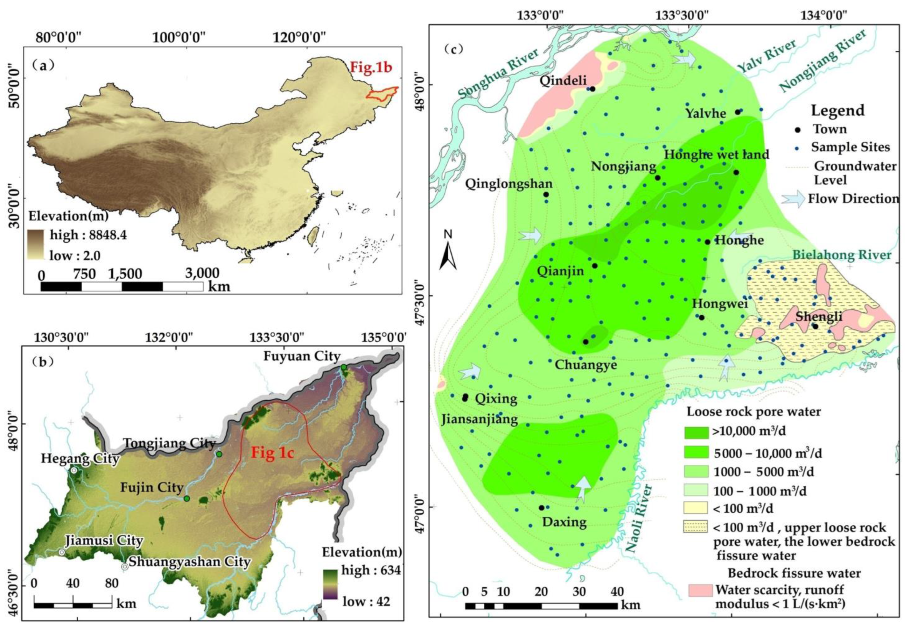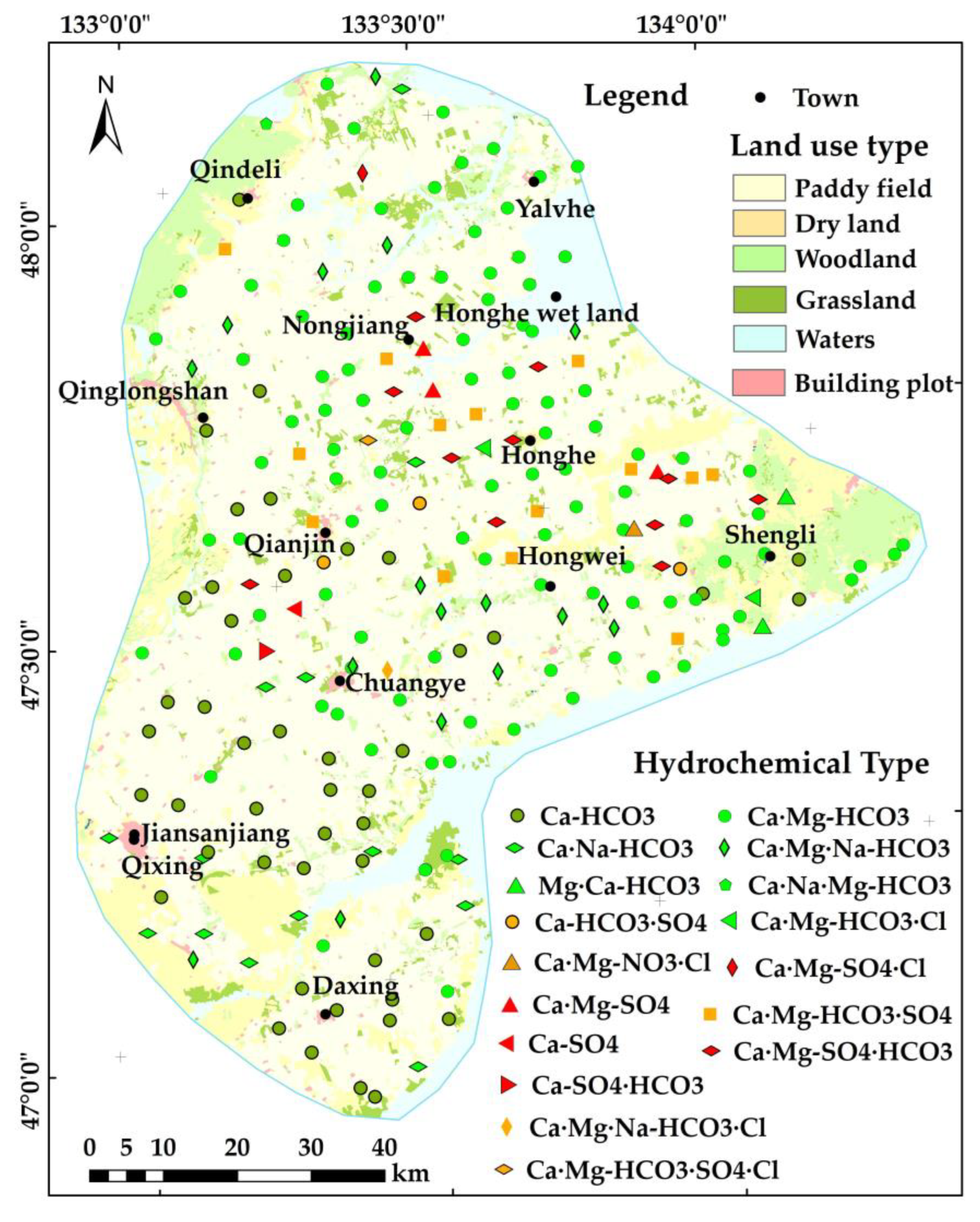 - Ye, X.; Zhou, Y.; Lu, Y.; Du, X. Hydrochemical Evolution and Quality Assessment of Groundwater in the Sanjiang Plain, China. Water 2022, 14, 1265. [Google Scholar] [CrossRef]