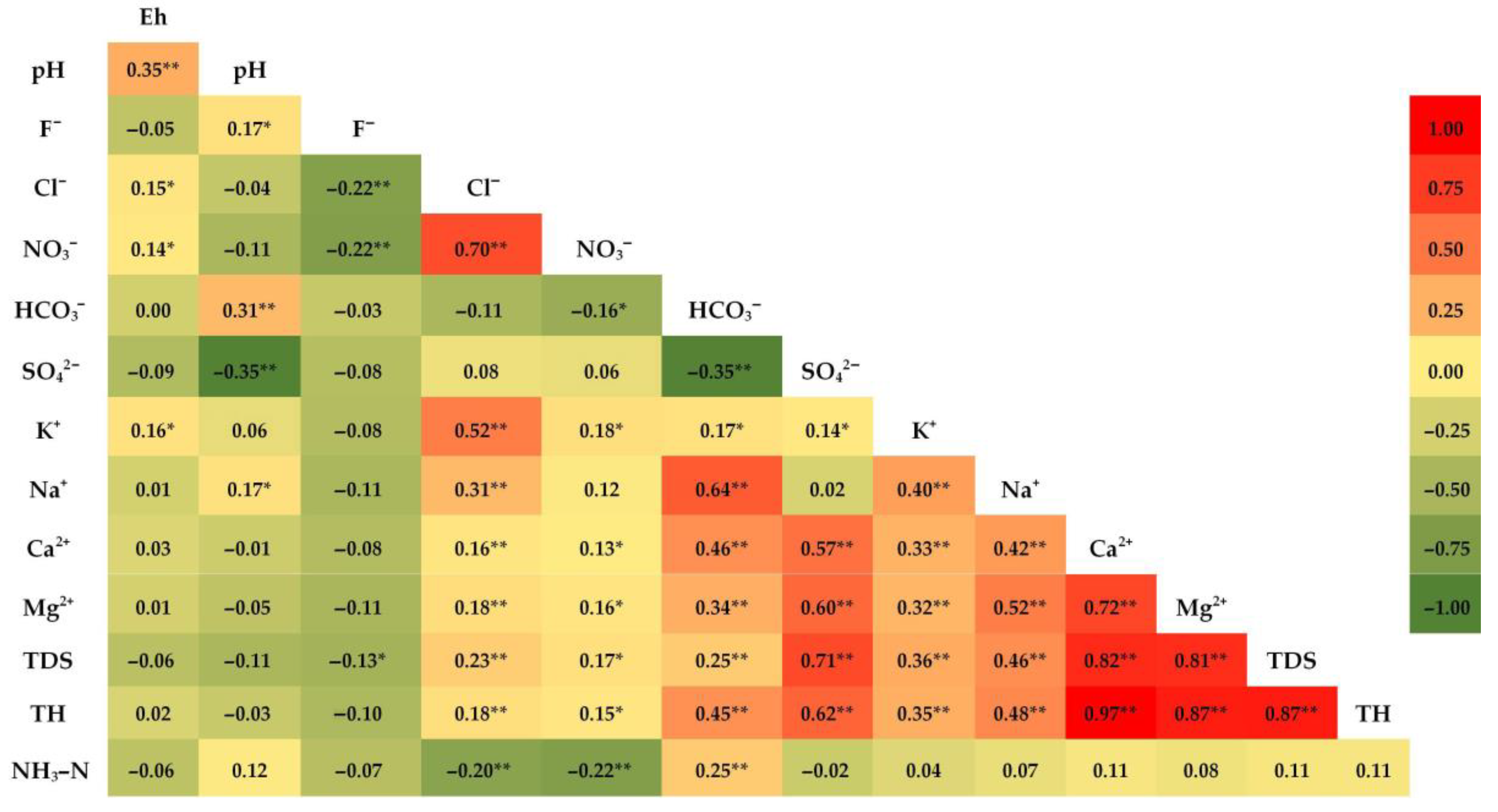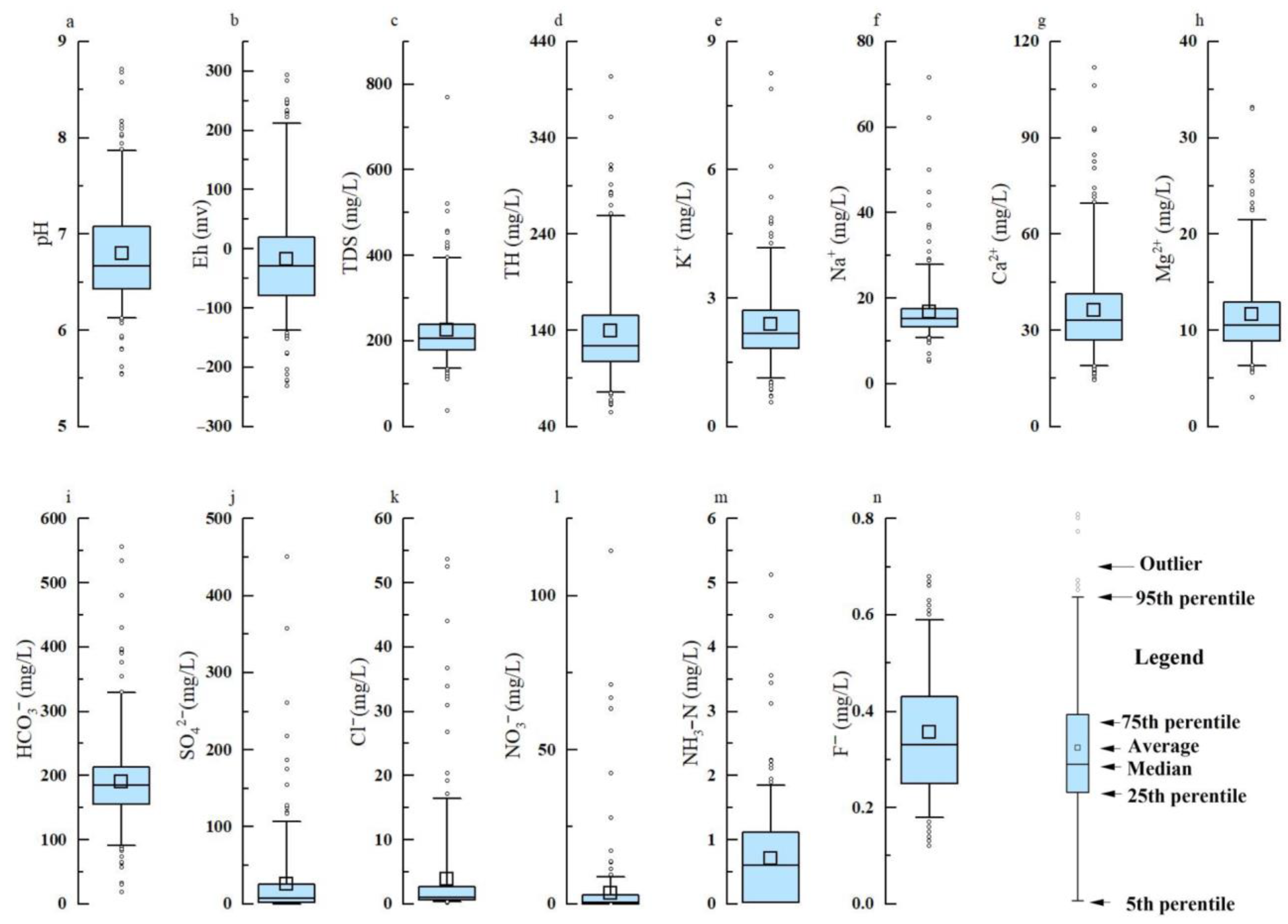 | Eh | pH | TDS | TH | K+ | Na+ | Ca2+ | Mg2+ | HCO3− | SO42− | Cl− | NO3− | NH3-N | F− | |