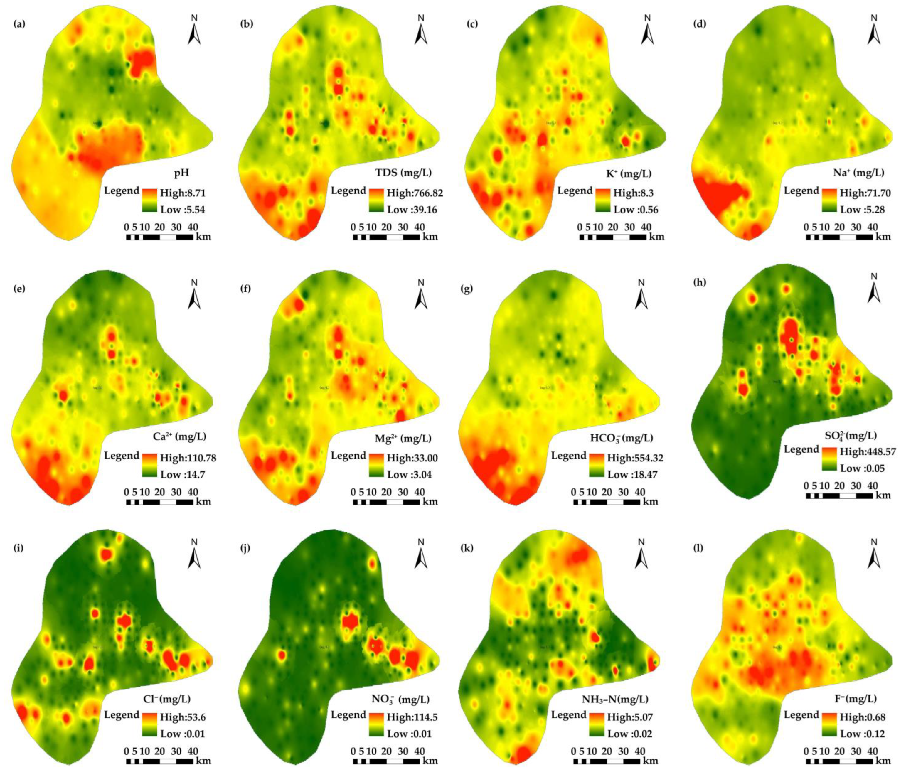- Li, C.; Gao, Z.; Chen, H.; Wang, J.; Liu, J.; Li, C.; Teng, Y.; Liu, C.; Xu, C. Hydrochemical analysis and quality assessment of groundwater in southeast North China plain using hydrochemical, entropy-weight water quality index, and GIS technique. Environ. Earth Sci. 2021, 80, 16. [Google Scholar] [CrossRef]