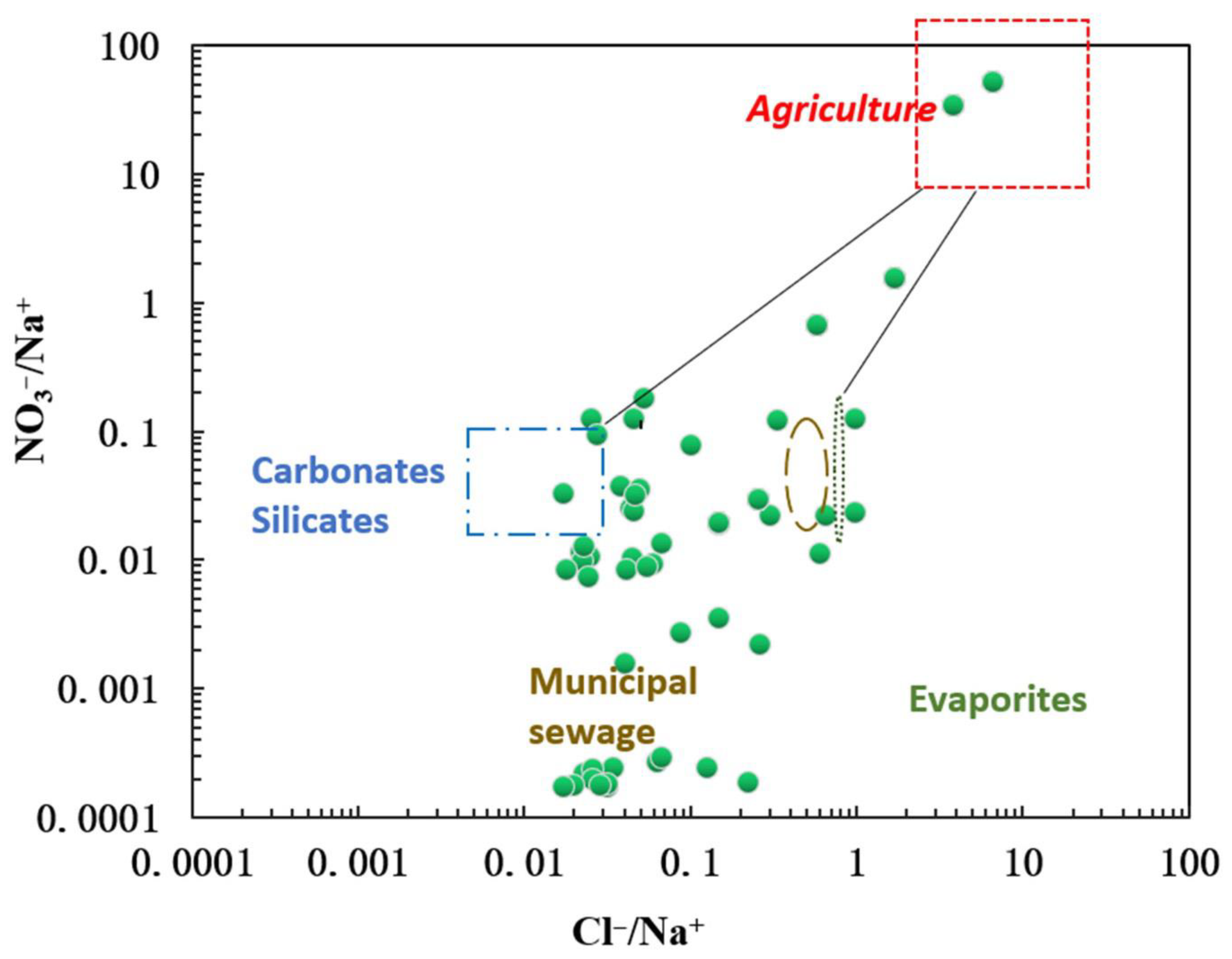 - Wang, S.; Chen, J.; Zhang, S.; Zhang, X.; Chen, D.; Zhou, J. Hydrochemical evolution characteristics, controlling factors, and high nitrate hazards of shallow groundwater in a typical agricultural area of Nansi lake basin, north China. Environ. Res. 2023, 223, 115430. [Google Scholar] [CrossRef] [PubMed]