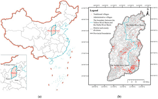 Location of study area. (a) China. The shaded pink area represents the administrative extent of Shanxi Province, the thick blue line delineates its provincial boundary, and the gray lines correspond to the administrative borders of neighboring provinces; (b) Location and distribution of villages in Shanxi Province. Red dots indicate the 619 traditional villages; gray dots indicate all administrative villages.