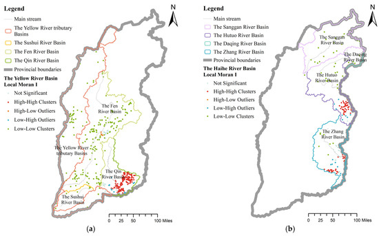 Local spatial autocorrelation of traditional village density. (a) The Yellow River Basin; (b) The Haihe River Basin. Red points indicate High–High clusters; green points indicate Low–Low clusters; orange points indicate High–Low outliers; blue points indicate Low–High outliers.