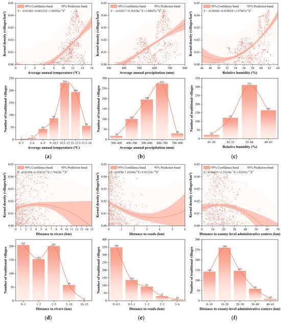 Relationships between village density (dependent variable) and influencing factors (independent variables). Top: fitted curves of village density versus each factor; dark shading represents 95% confidence band; light shading represents 95% prediction band; the red dots represent the distribution of traditional villages across the factor intervals. Bottom: histograms of village count by factor intervals. The fitted curves align with the distributional patterns indicated by the histograms. (a) Average annual temperature; (b) Average annual precipitation; (c) Relative humidity; (d) Distance to rivers; (e) Distance to roads; (f) Distance to county-level administrative centers.