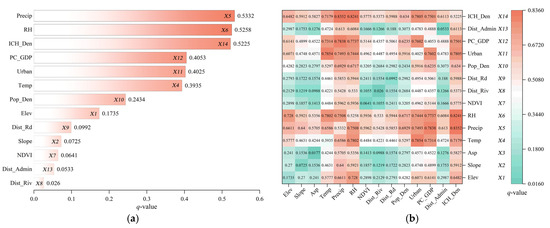OPGD was applied to identify dominant factors, with the kernel density of traditional villages as the dependent variable and the aforementioned 14 factors as independent variables. The results indicated that all factors passed the 1% significance test except the aspect factor (X3). Figure 6a shows that, in the single-factor analysis, average annual precipitation (X5, q = 0.5332) exhibited the strongest explanatory power, followed by relative humidity (X6, q = 0.5258), and ICH density (X14, q = 0.5225). Environmental and historical–cultural factors demonstrated greater influence than socioeconomic factors. Figure 6b shows that the two-factor interactions exhibited a significant positive synergistic effect, with the strongest interaction between average annual precipitation and ICH density (q = 0.8352), followed by interactions between average annual precipitation and urbanization rate (q = 0.7854) and between relative humidity and per capita GDP (q = 0.7838).