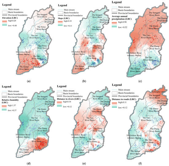 Environmental factors constitute the fundamental constraints on the spatial distribution of traditional villages. Table 4 reveals that 22.1% of the LRCs for elevation were positive, while 64.6% of all coefficients were significant (p < 0.05), suggesting a clear negative relationship (Figure 7a). The direction was determined by the dominant sign of the LRCs, and the strength was measured by the proportion of statistically significant coefficients. High positive LRCs values were mainly concentrated in the middle and lower reaches of the Fen and Qin River Basins, as well as in the lower reaches of the Yellow River tributary Basins. Shanxi Province is situated on the Loess Plateau, with an average elevation of approximately 1100 m. Villages are predominantly distributed across plains, terraces, and low- to mid-elevation hills. These areas feature flat terrain and fertile soil, providing favorable conditions for agricultural production and supporting the stable settlement of large populations. High-altitude areas can provide natural isolation for villages, reducing the impacts of warfare and modern development. However, such areas are also prone to soil erosion and landslides. In addition, cold climatic conditions and limited transportation access are unfavorable for the long-term development of villages.