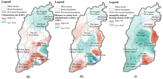 Figure 7g shows that the positive LRCs for urbanization rate was 37.0%, and the proportion of significant coefficients was 22.5%, indicating an overall negative effect. High positive values were observed in tourism-oriented villages in the middle and lower reaches of the Qin River Basin and the northern and middle sections of the Zhang River Basin. In tourism hubs like Yincheng ancient town in Changzhi City, urbanization provides vital infrastructure and markets. Yet, beyond these clusters, its predominant effect is one of systemic hollowing out. The significant negative coefficients demonstrate that urban expansion acts as a powerful siphon, drawing away the younger generation and destabilizing local economies [45,46,47]. This exodus severs the intergenerational transmission of ICH and erodes the social fabric, leading to a critical loss of custodians for both tangible and intangible heritage. The sustainability threat here is not merely physical encroachment, but the collapse of the socio-cultural community itself.