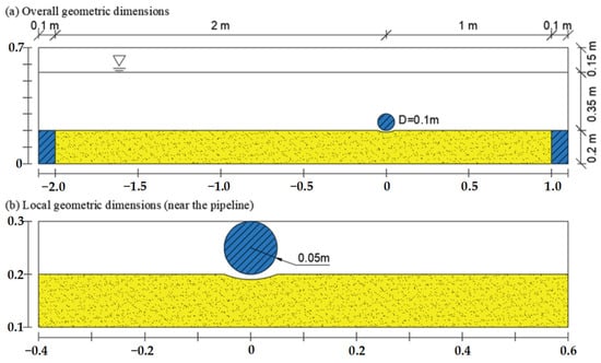 The conditions of the flat bed are categorized into two main groups, with a total of five scenarios, based on variations in pipeline diameter and water depth. The flow field parameters for each scenario are shown in Table 1. To ensure the full development of the flow field in front of the pipeline, a sand bed length of 20 times the diameter is set in front of it. To prevent the interference from the outflow boundary on the flow field near the pipeline, a sand bed length of 10 times the diameter is set behind it. The sand bed has a uniform thickness of 0.2 m, and an air height of 0.15 m is established to facilitate normal simulation of the free liquid surface. To prevent the inflow and outflow boundaries from affecting the ends of the sand bed, solid baffles of the same height as the sand bed are placed at both sides of the bed. The pipeline is perpendicular to the flow direction, with a burial depth of 0.0 m, meaning the lowest end is in contact with the bed surface. An initial scour pit, with a depth of 0.1 times the diameter, is set below the pipeline to simulate the start of scouring. Some researchers have shown that the presence of an initial scour pit slightly accelerates the early development of scour but has minimal impact on later stages or scour equilibrium []. Taking Case 1 as an example, the overall model and the local geometric scale around the pipeline are illustrated in Figure 1.